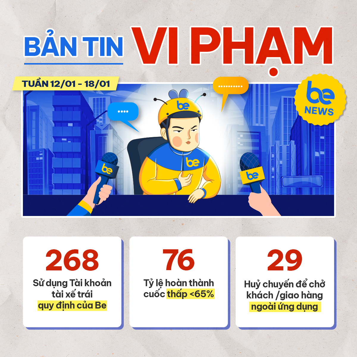 Trong tuần từ 12.01.2026 – 18.01.2026, hệ thống Be đã ghi nhận nhiều trường hợp vi phạm Bộ Quy tắc Ứng xử. Các hành vi vi phạm bao gồm không tuân thủ quy định hoạt động, gây ảnh hưởng đến chất lượng dịch vụ và sự an toàn cho hành khách cũng như cộng đồng.