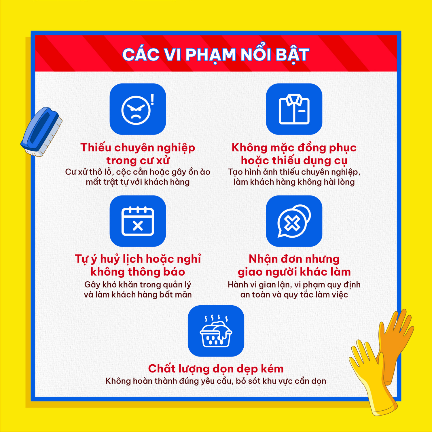 Trong tuần 10.11.2025 – 16.11.2025, hệ thống ghi nhận một số trường hợp vi phạm nội quy làm việc và quy trình vận hành dịch vụ. Các lỗi phổ biến bao gồm thao tác sai trên ứng dụng, đi trễ, không mang đầy đủ dụng cụ hoặc không mặc đồng phục đúng quy định.