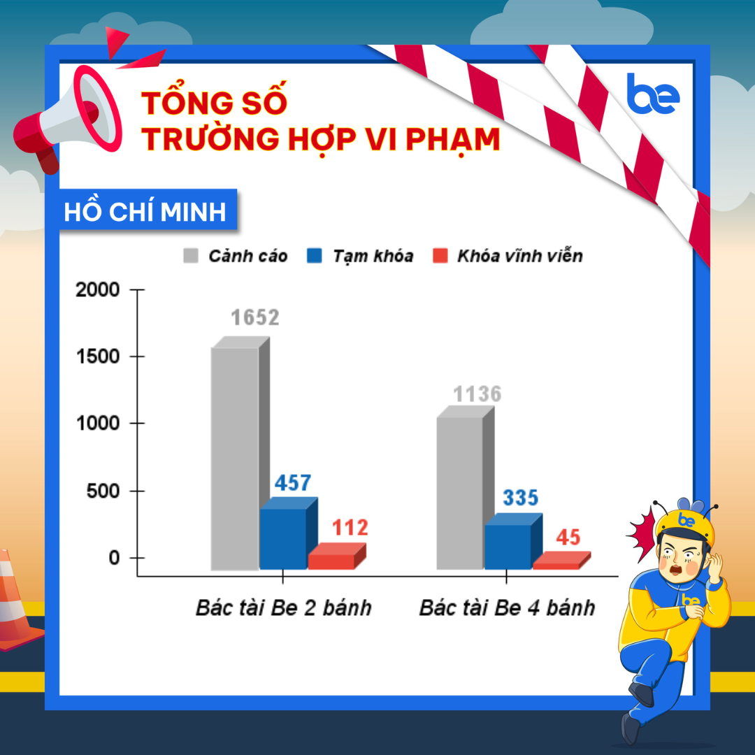 Đặc biệt, với các trường hợp vi phạm nghiêm trọng như gây mất an toàn, ảnh hưởng đến an ninh trật tự, Be đã áp dụng mức chế tài cao nhất: khóa tài khoản vĩnh viễn, không hỗ trợ mở lại dưới bất kỳ hình thức nào.