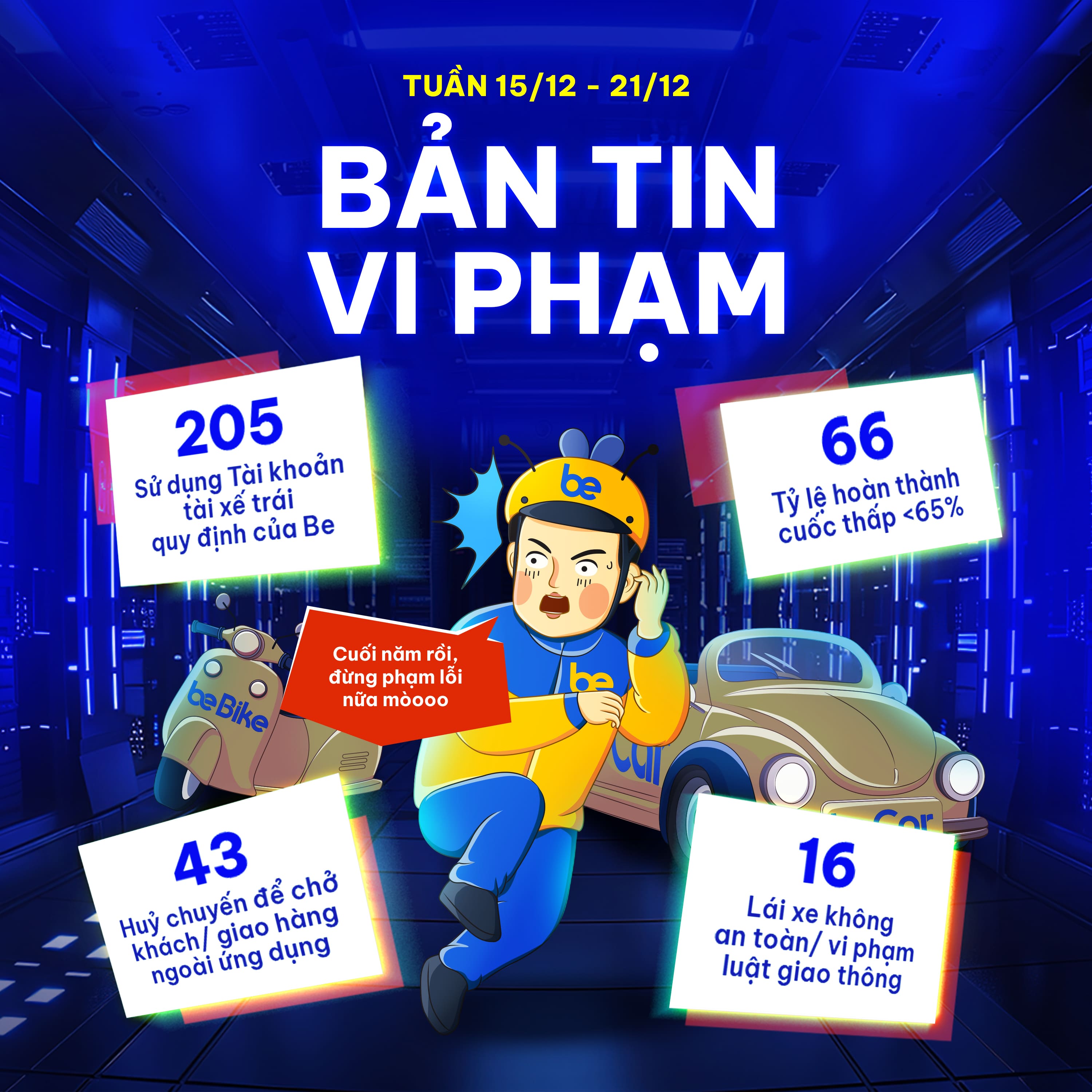 Trong tuần từ 15.12.2025 – 21.12.2025, hệ thống Be đã ghi nhận nhiều trường hợp vi phạm Bộ Quy tắc Ứng xử. Các hành vi vi phạm bao gồm không tuân thủ quy định hoạt động, gây ảnh hưởng đến chất lượng dịch vụ và sự an toàn cho hành khách cũng như cộng đồng.