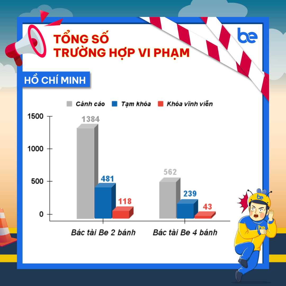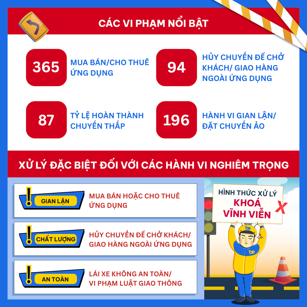 Đặc biệt, với các trường hợp vi phạm nghiêm trọng như gây mất an toàn, ảnh hưởng đến an ninh trật tự, Be đã áp dụng mức chế tài cao nhất: khóa tài khoản vĩnh viễn, không hỗ trợ mở lại dưới bất kỳ hình thức nào.