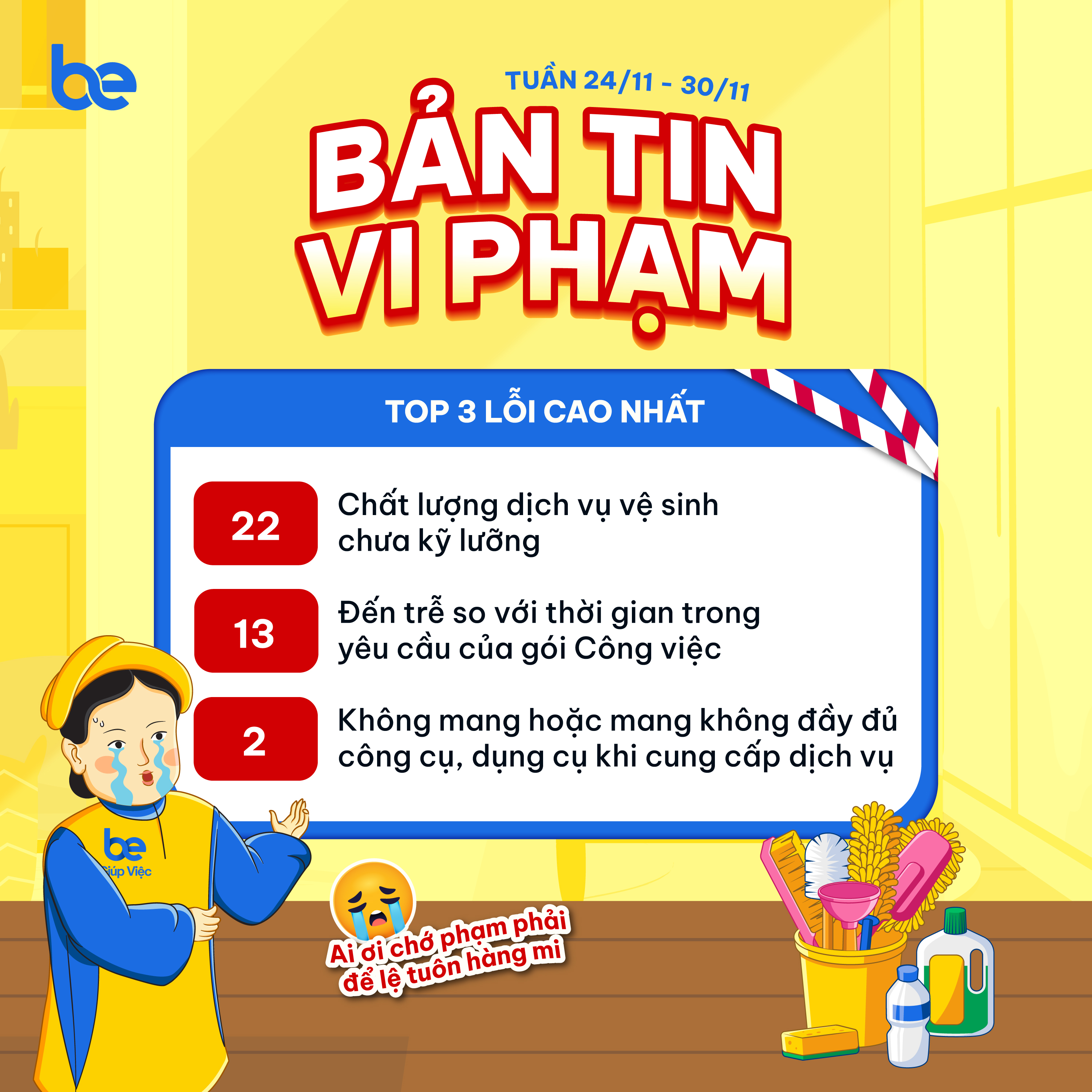 Trong tuần 24.11.2025 – 30.11.2025, hệ thống ghi nhận một số trường hợp vi phạm nội quy làm việc và quy trình vận hành dịch vụ.