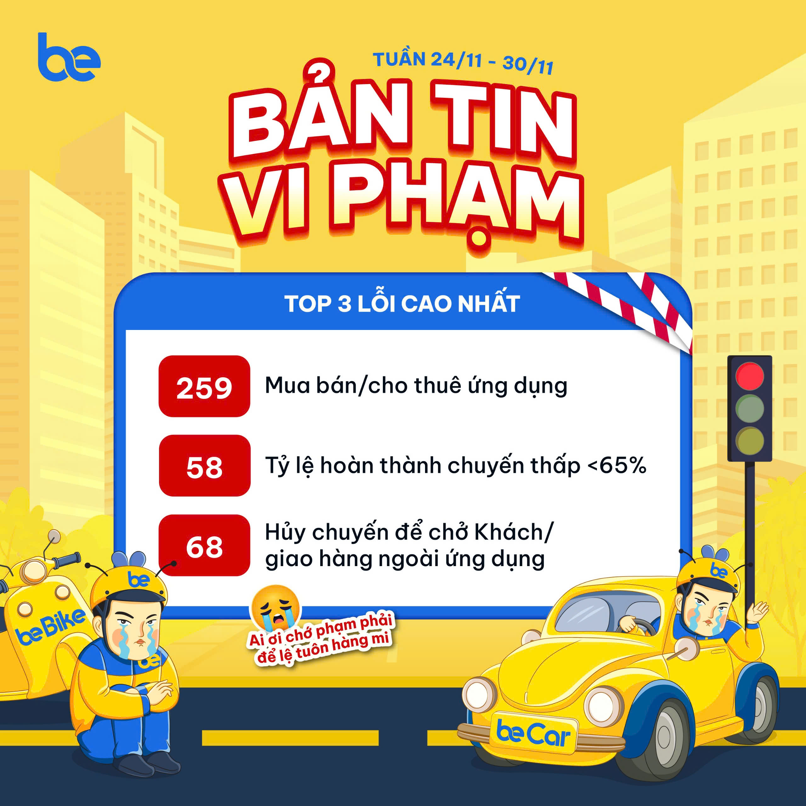 Trong tuần 24.11.2025 – 30.11.2025, hệ thống Be ghi nhận nhiều trường hợp vi phạm Bộ Quy tắc Ứng xử.