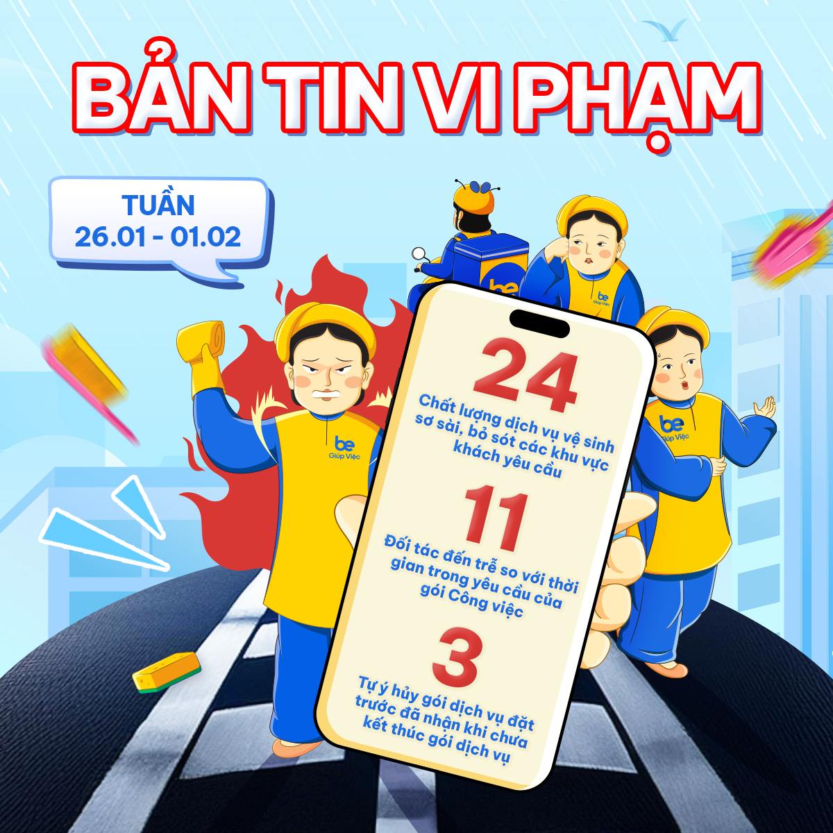 Trong tuần 26.01.2026 – 01.02.2026, Be ghi nhận nhiều trường hợp Đối tác vi phạm Bộ Quy Tắc Ứng Xử của Be như gian lận, thao tác sai, đi trễ, không mang đủ dụng cụ hoặc mặc sai đồng phục… và đã áp dụng chế tài tương ứng với mức chế tài cao nhất là khóa tài khoản vĩnh viễn.