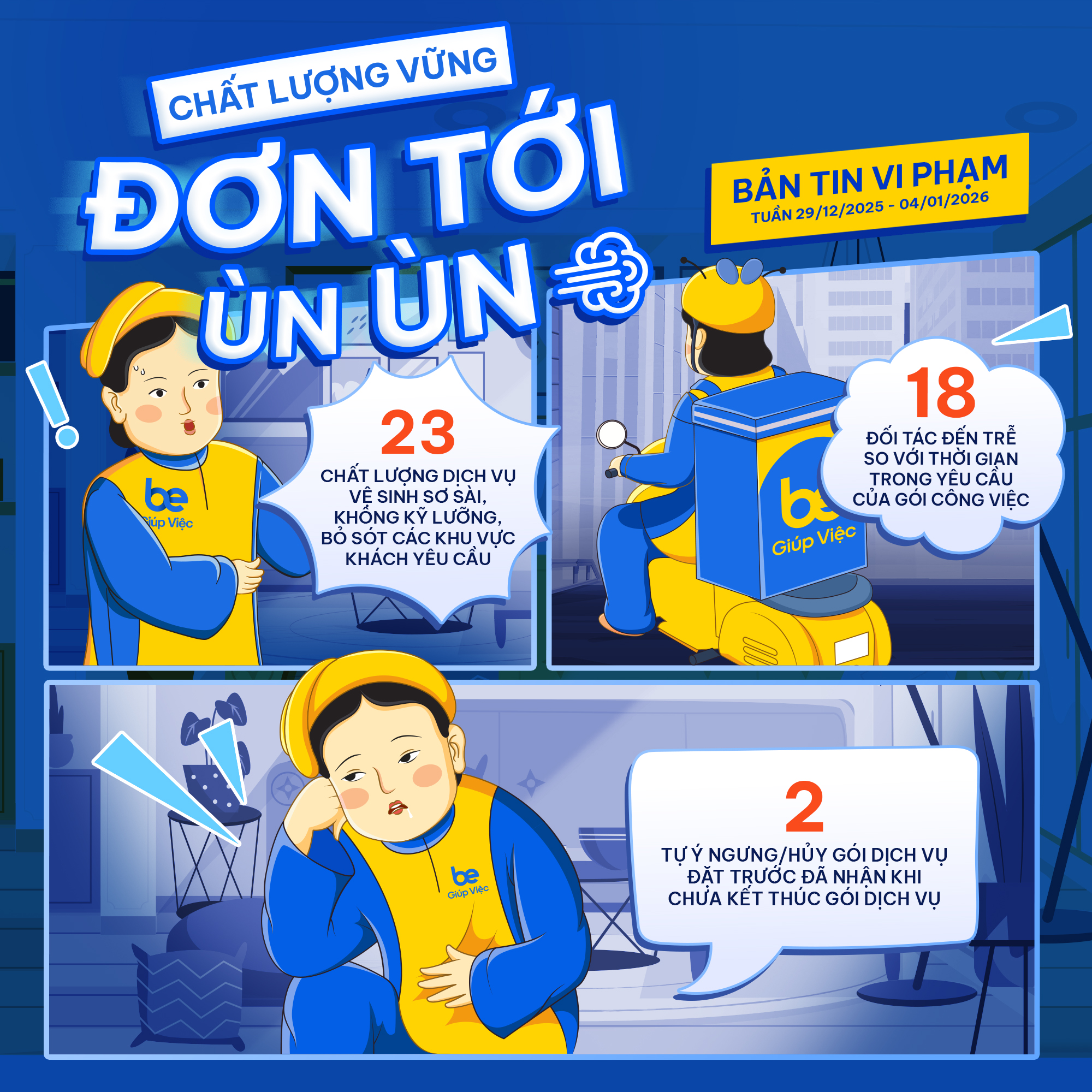 Trong tuần 22.12.2025 – 28.12.2025, Be ghi nhận nhiều trường hợp Đối tác vi phạm Bộ Quy Tắc Ứng Xử của Be như gian lận, thao tác sai, đi trễ, không mang đủ dụng cụ hoặc mặc sai đồng phục… và đã áp dụng chế tài tương ứng với mức chế tài cao nhất là khóa tài khoản vĩnh viễn.