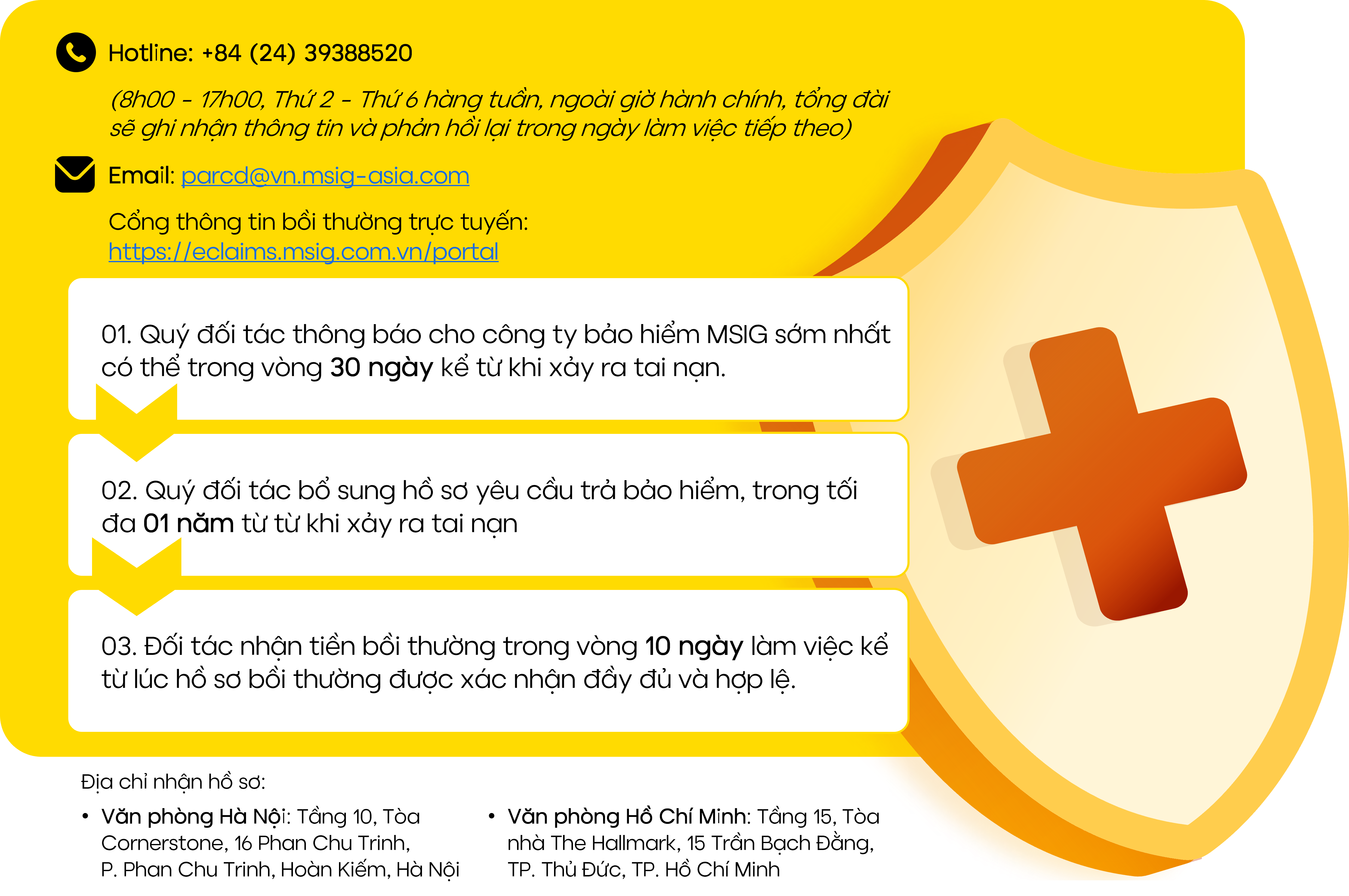 Trường hợp không may xảy ra tai nạn, Quý đối tác có Bảo hiểm nên lập tức liên hệ với công ty Bảo hiểm MSIG để gửi yêu cầu bảo hiểm và nhận hướng dẫn hồ sơ chi tiết.