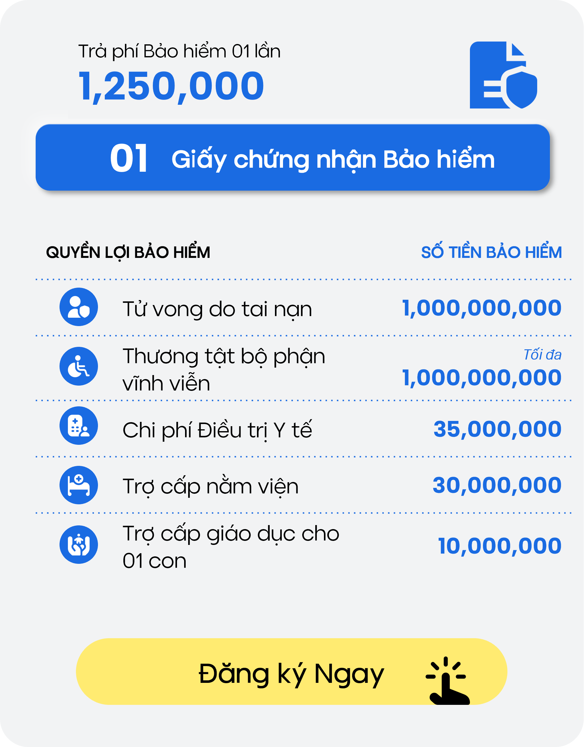 Trả toàn bộ phí bảo hiểm 1,250,000VND trong một lần đóng tiền. Quý đối tác nhận một giấy chứng nhận với số tiền bảo hiểm tối đa lên đến 1 tỷ đồng, thời hạn bảo hiểm một (1) năm kể từ ngày đóng phí.