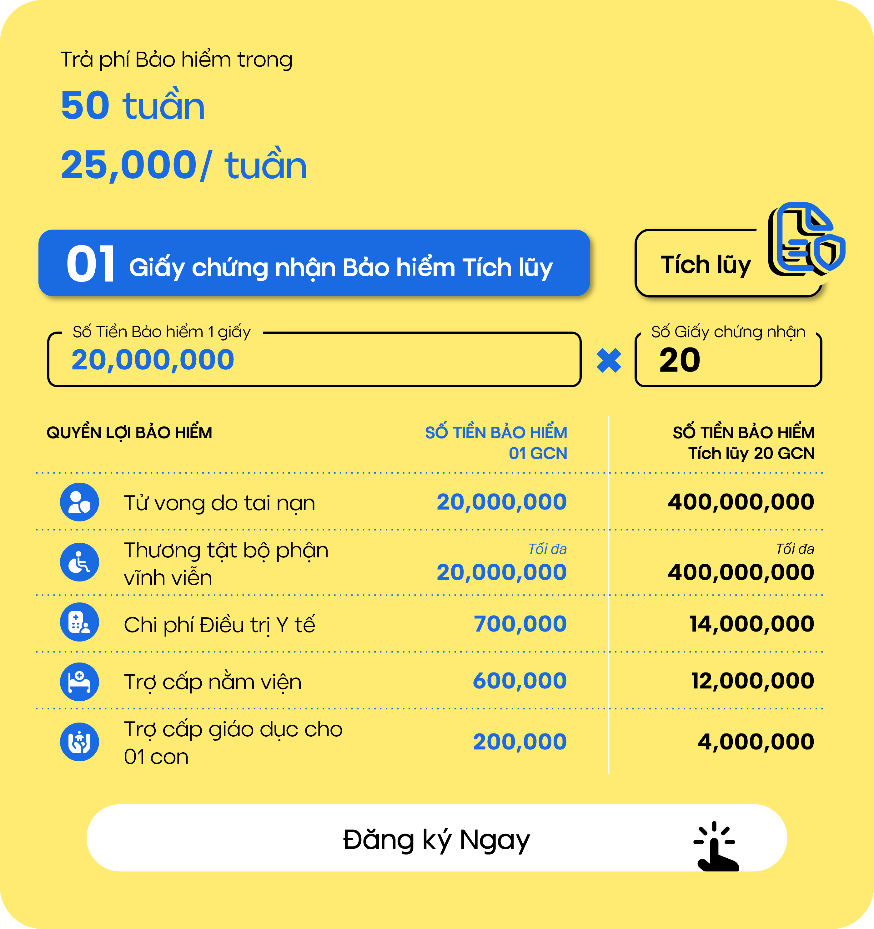 Quý đối tác sẽ tích lũy Giấy chứng nhận qua mỗi lần đóng phí tuần. Mỗi giấy chứng nhận có mức bảo hiểm 20 triệu đồng, hiệu lực một (01) năm kể từ ngày đóng phí thành công.