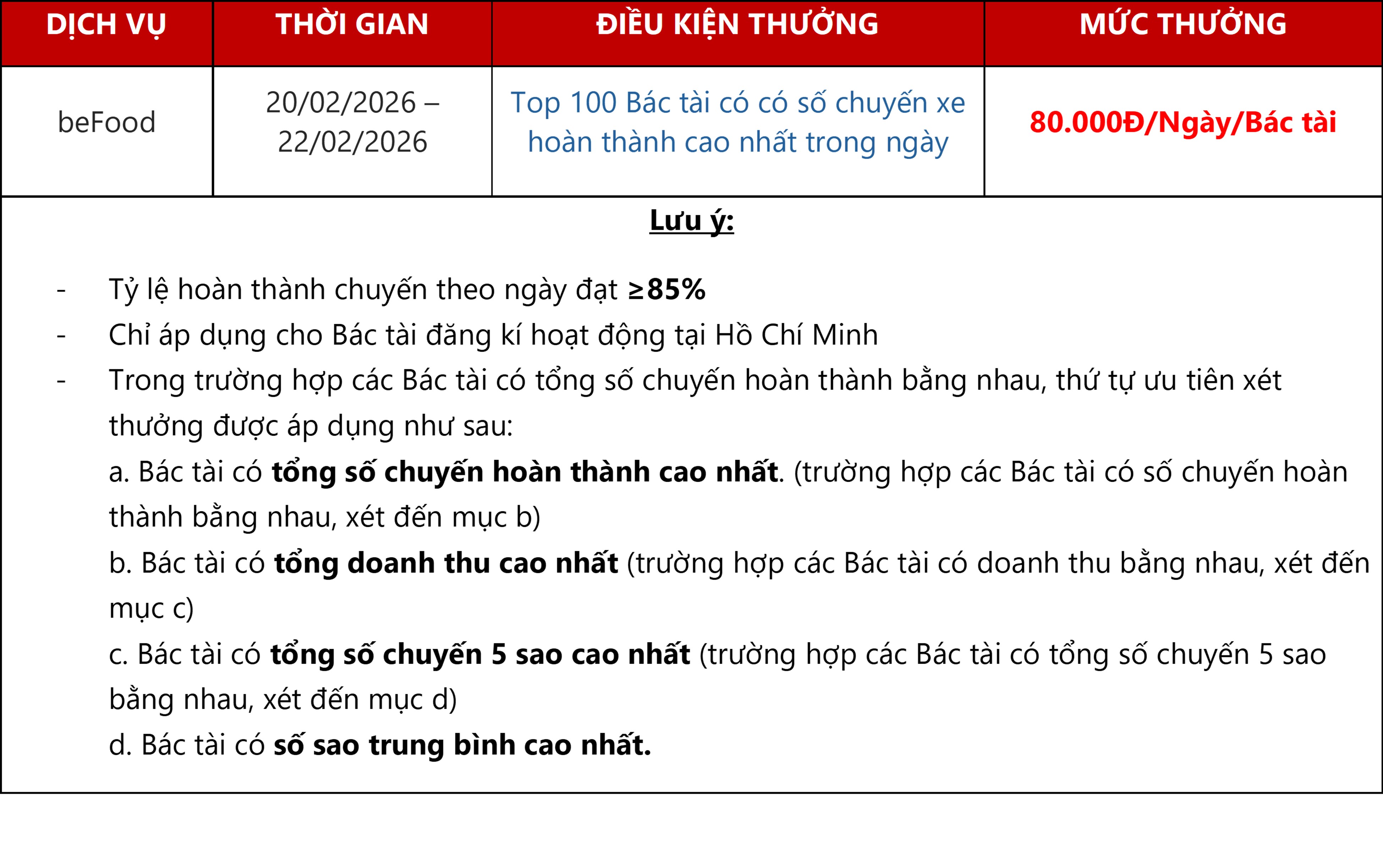Để đồng hành cùng Bác tài suốt mùa cao điểm, Be triển khai CHUỖI CHƯƠNG TRÌNH THƯỞNG TẾT NGUYÊN ĐÁN 2026, áp dụng trước – trong – sau Tết.