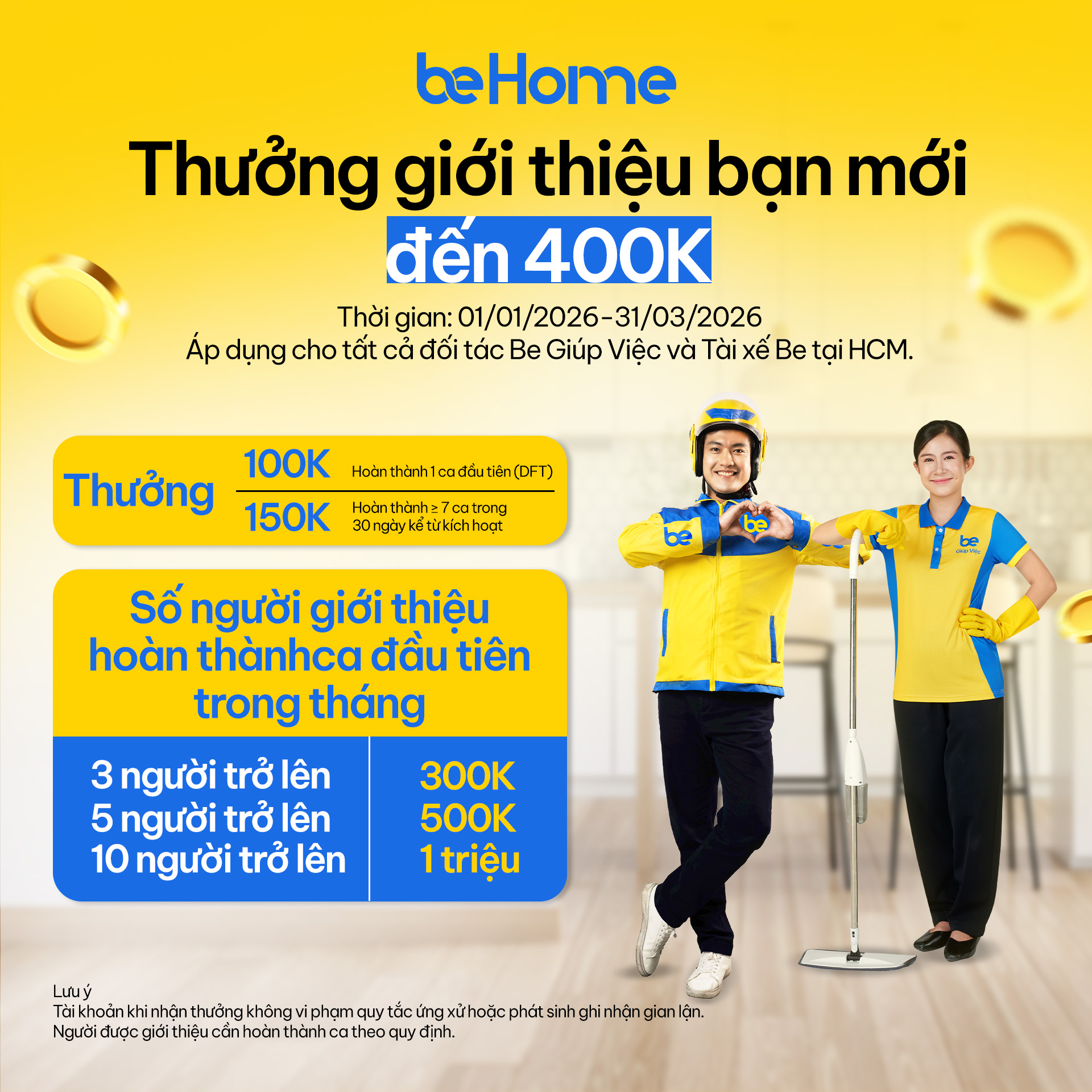 | beGiúpviệc | Hồ Chí Minh | Hoàn thành 1 ca làm đầu tiên | Trong 30 ngày đầu tiên kể từ lúc kích hoạt tài khoản | 100.000Đ |