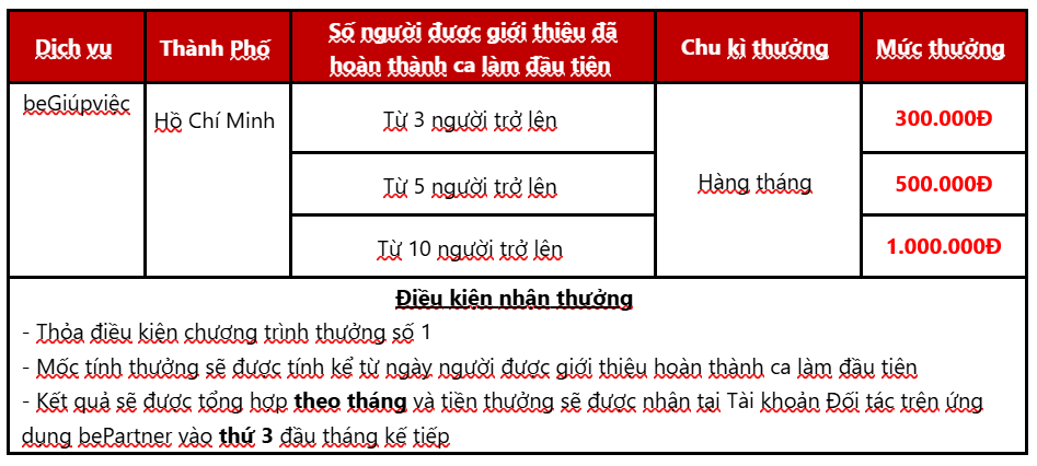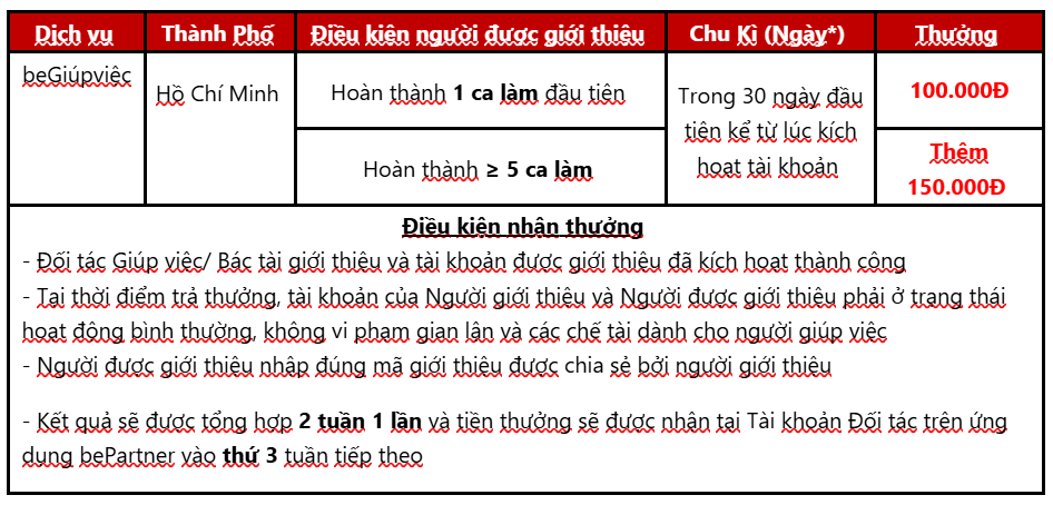 - Đối tác không bị ghi nhận vi phạm khóa/tạm khóa về chất lượng, gian lận, an toàn trong suốt thời gian diễn ra chương trình “Giới thiệu Đối tác giúp việc mới”.