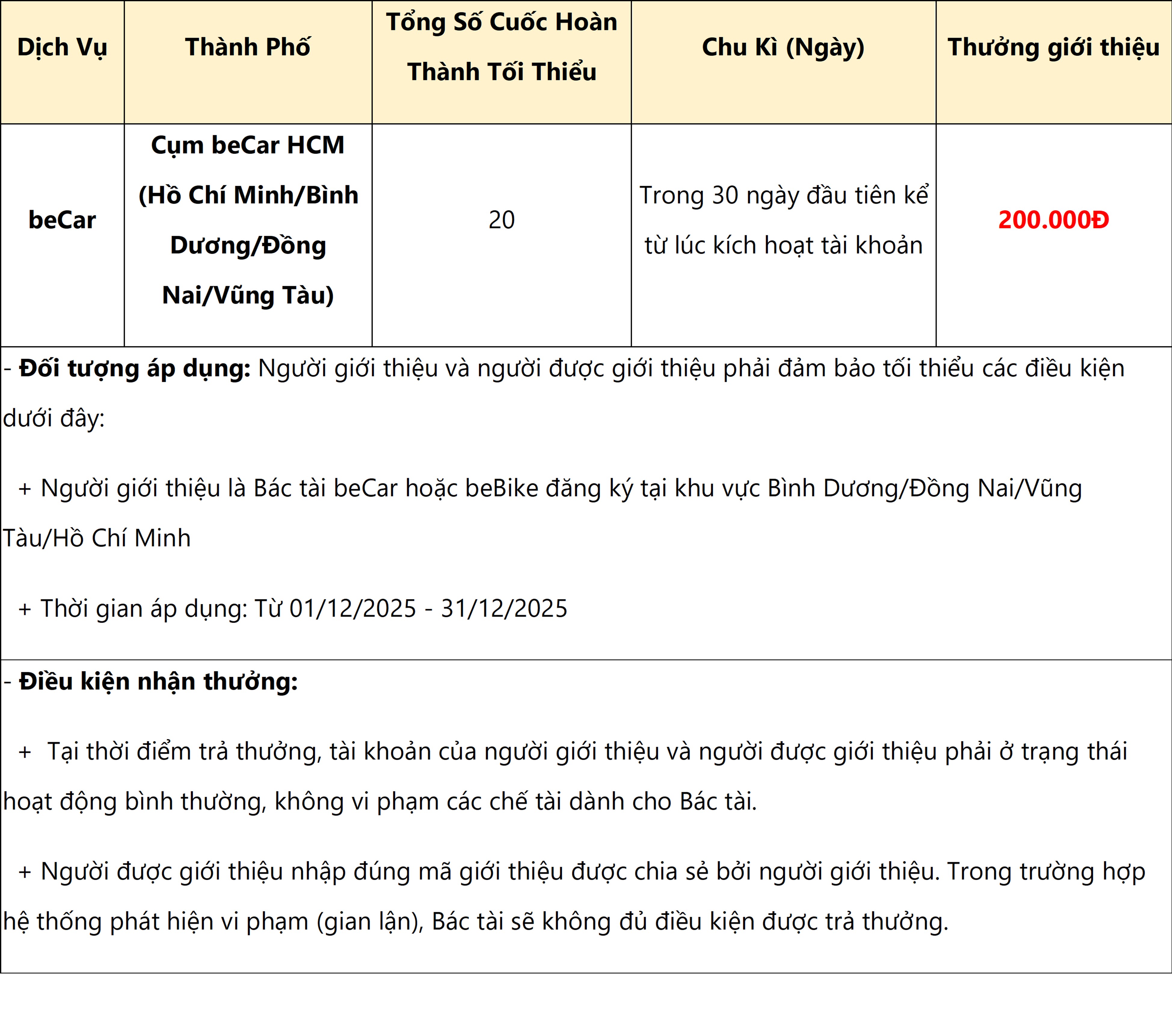 - 🚗 200.000Đ cho mỗi Bác tài beCar giới thiệu và kích hoạt thành công
