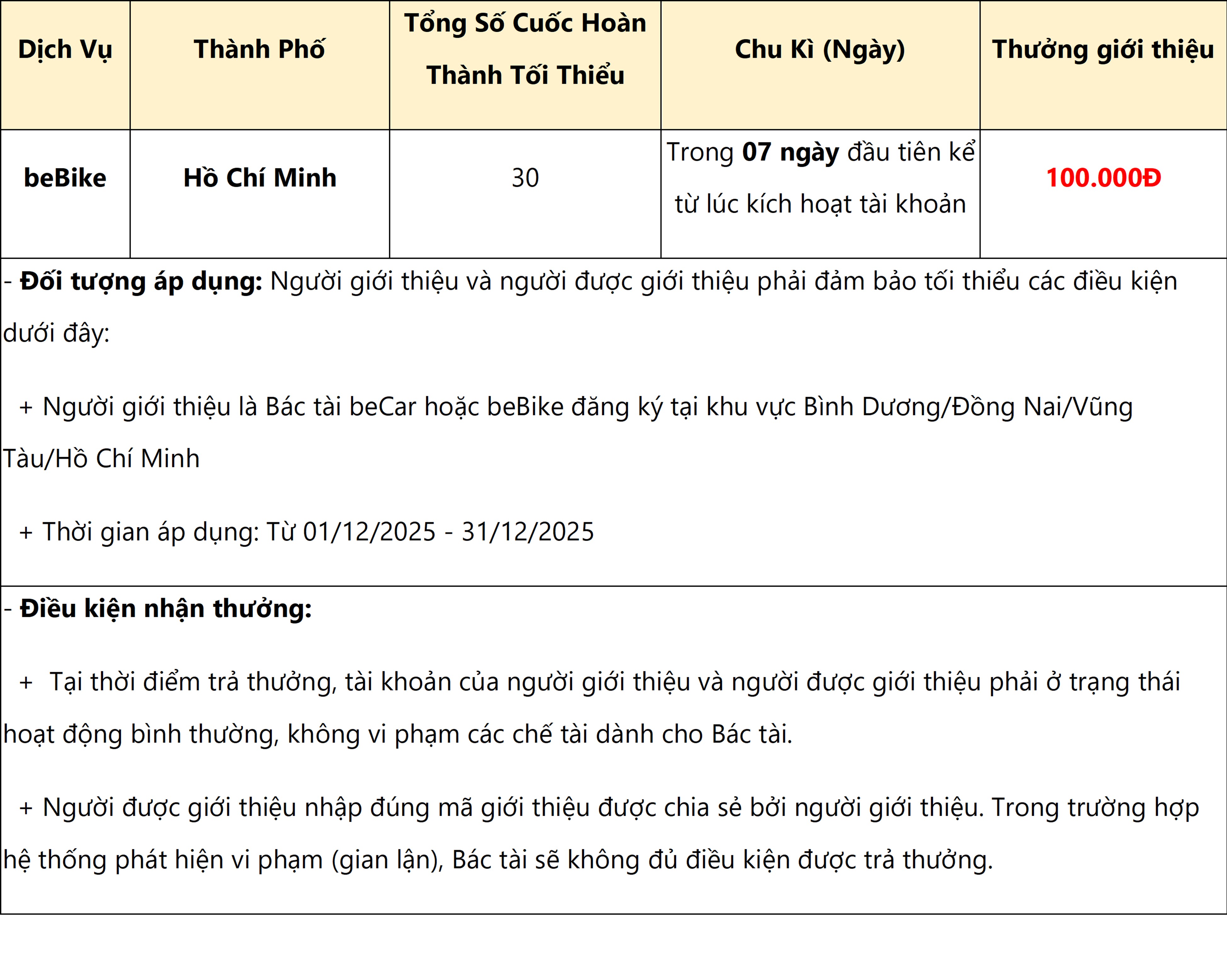 - 🛵 100.000Đ cho mỗi Bác tài beBike giới thiệu và kích hoạt thành công