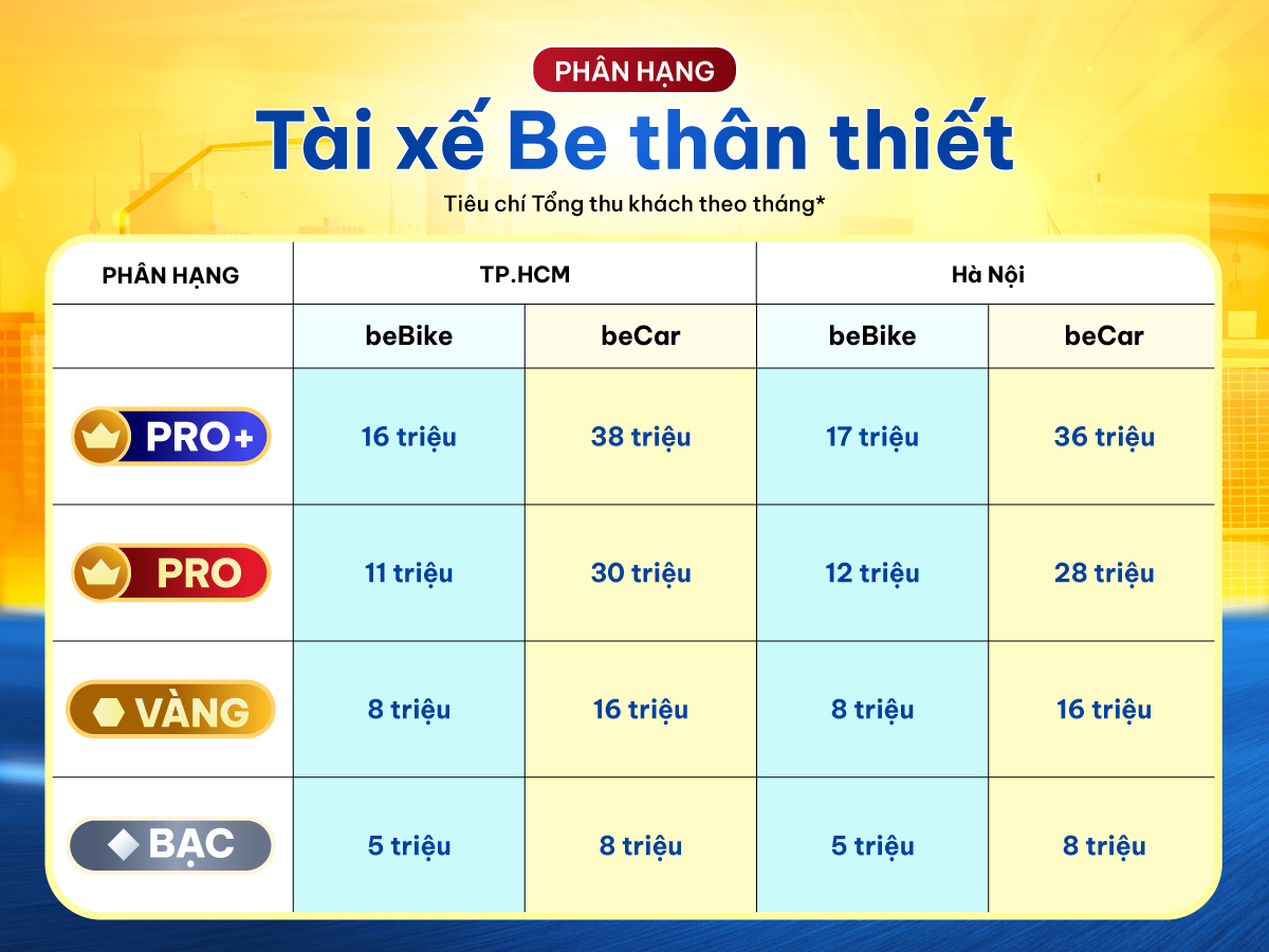 Tài xế Be thân thiết được chia thành 4 phân hạng, được quyết định bởi Kết quả hoạt động theo Tháng và đáp ứng các tiêu chí chất lượng và đào tạo của tháng trước đó (Chi tiết xem TẠI ĐÂY).