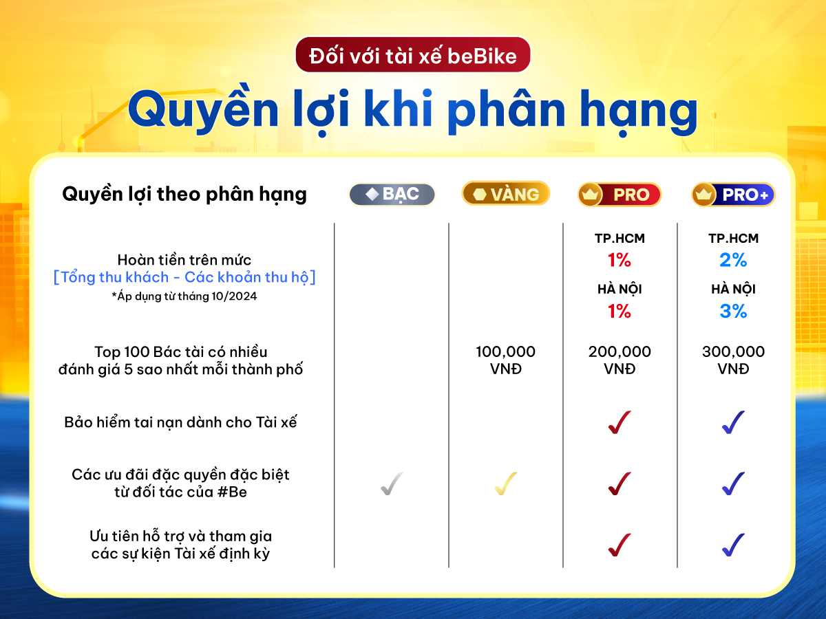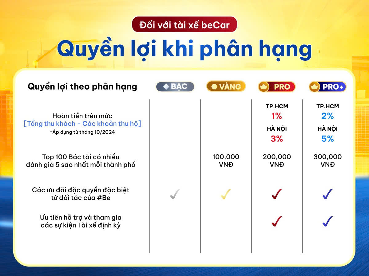 – Tài xế be đạt mức phân hạng nào thì sẽ được hưởng các quyền lợi tương ứng với phân hạng đó trong 03 tháng (bắt đầu từ khi nhận được thông báo phân hạng).