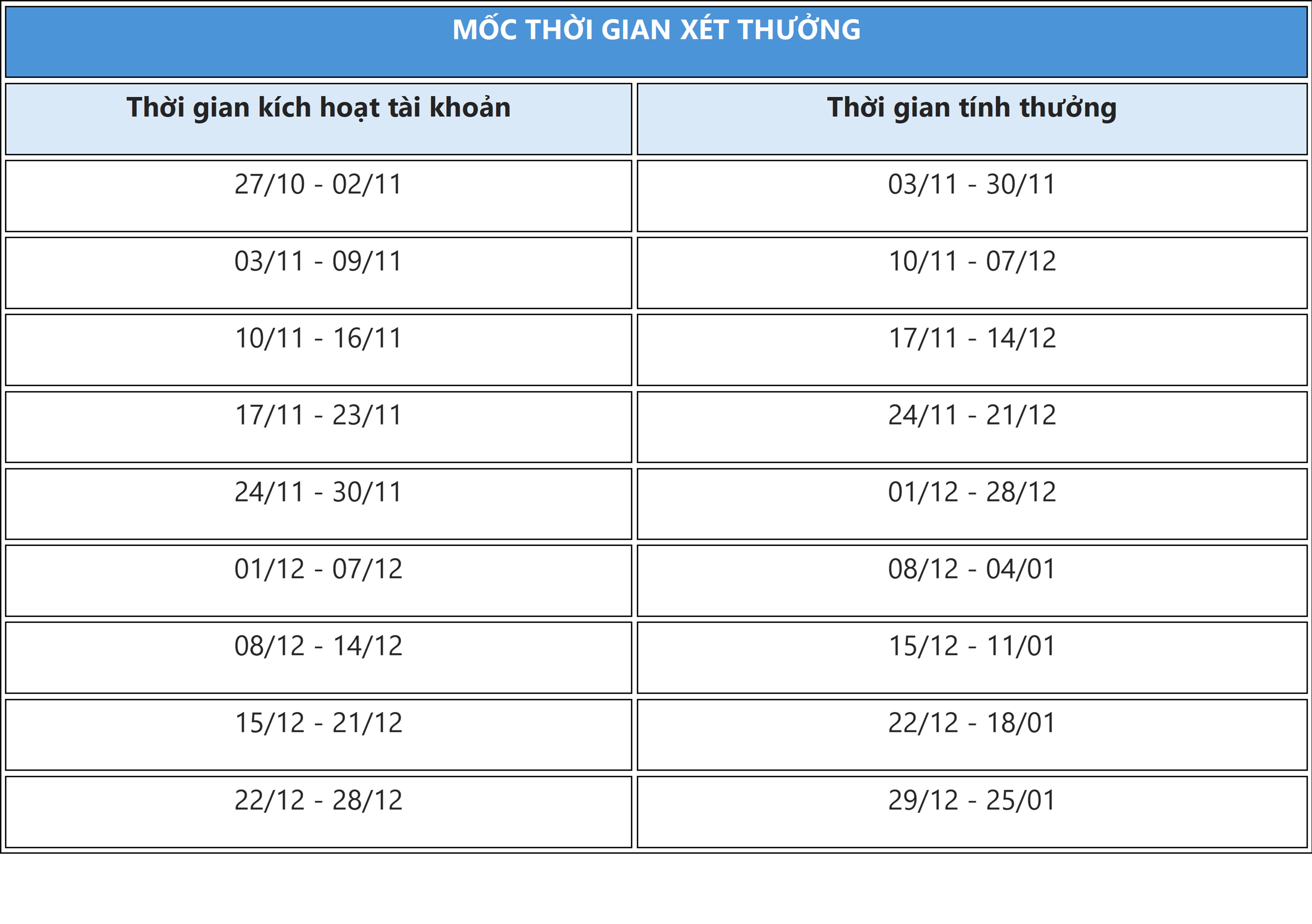 - Thời gian gửi kết quả thưởng dự kiến vào thứ 3 của tuần tiếp theo