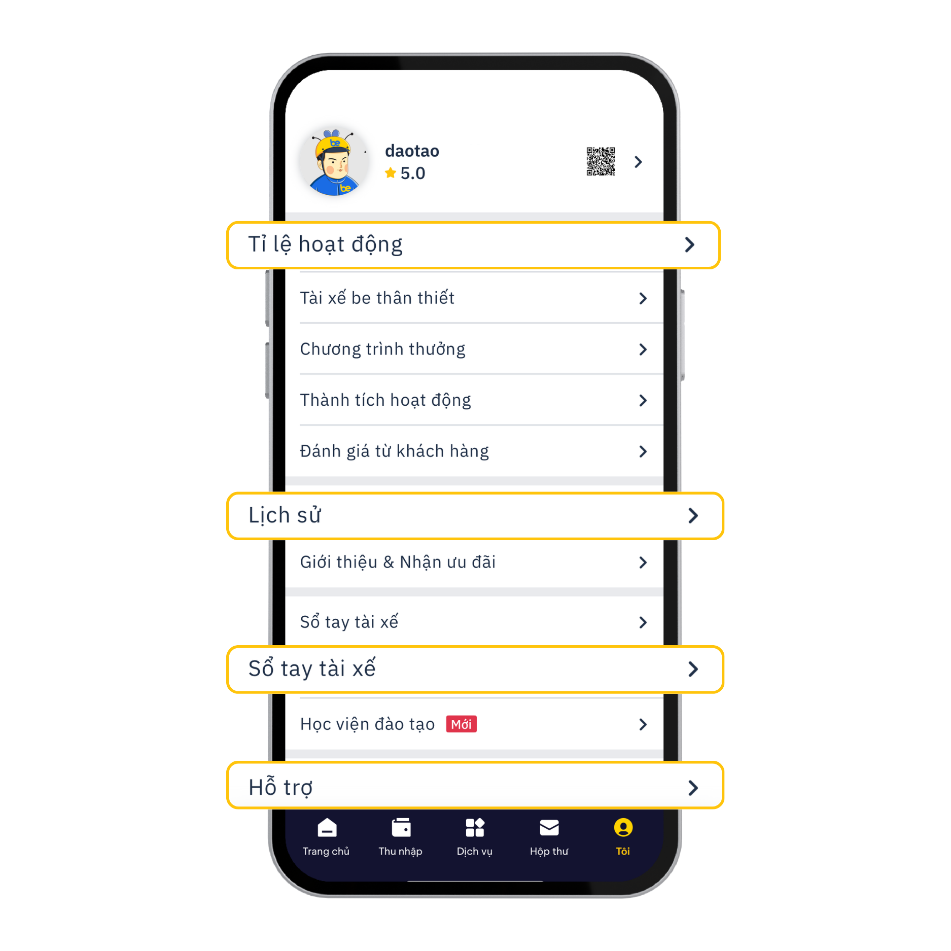 Đáp: Trên ứng dụng bePartner, anh/chị vào mục Tôi > Sổ tay tài xế