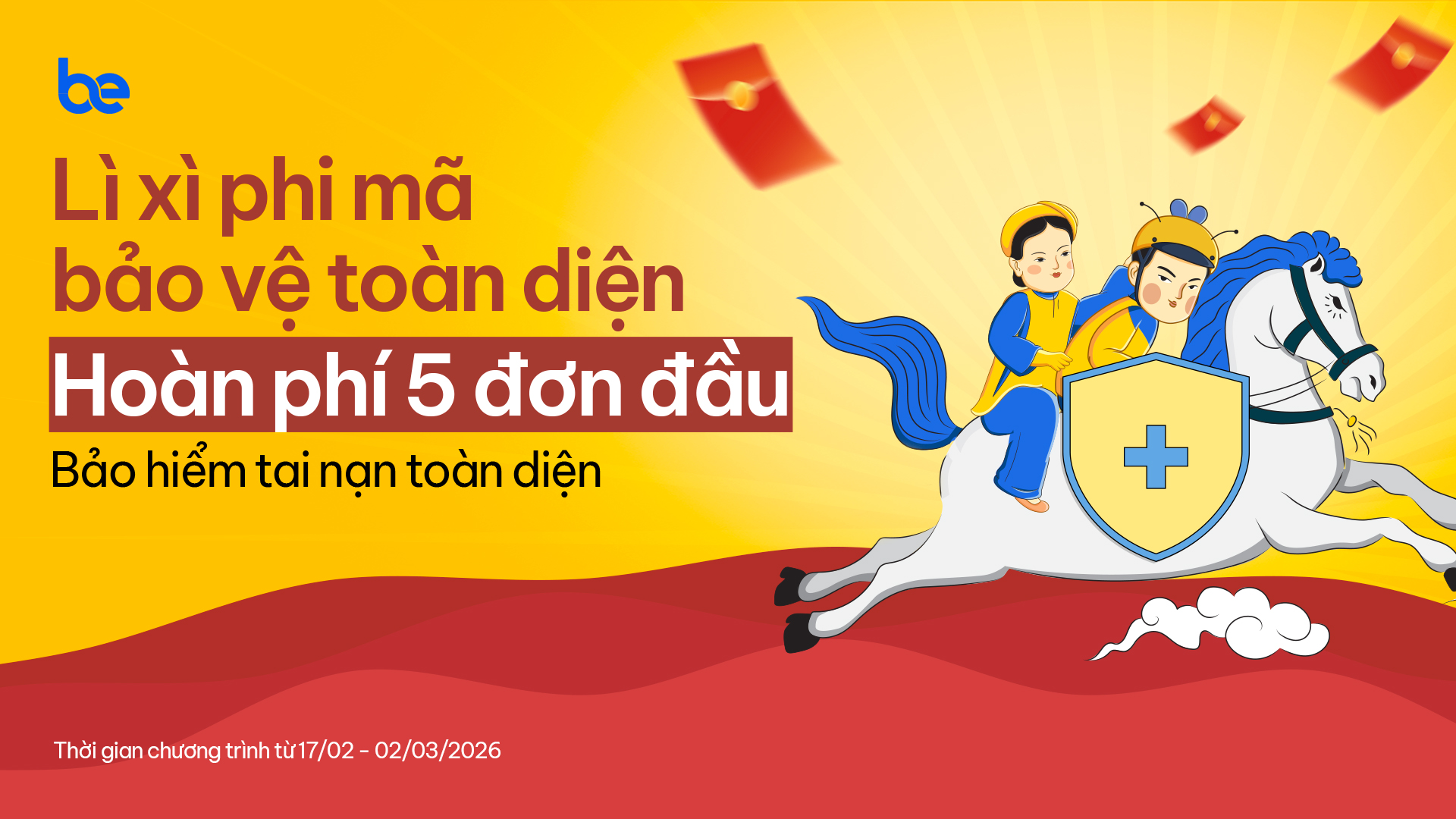 Be gửi đến lì xì may mắn khi Đối tác mua mới Bảo hiểm Tai nạn Toàn Diện, vừa an tâm đồng hành, vừa có cơ hội hoàn tiền hấp dẫn về ví.