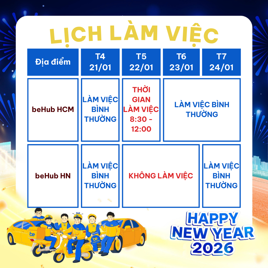 Be xin thông tin đến Đối tác lịch làm việc ở Hub từ ngày 22/01/2026 đến ngày 25/01/2026 như sau:
