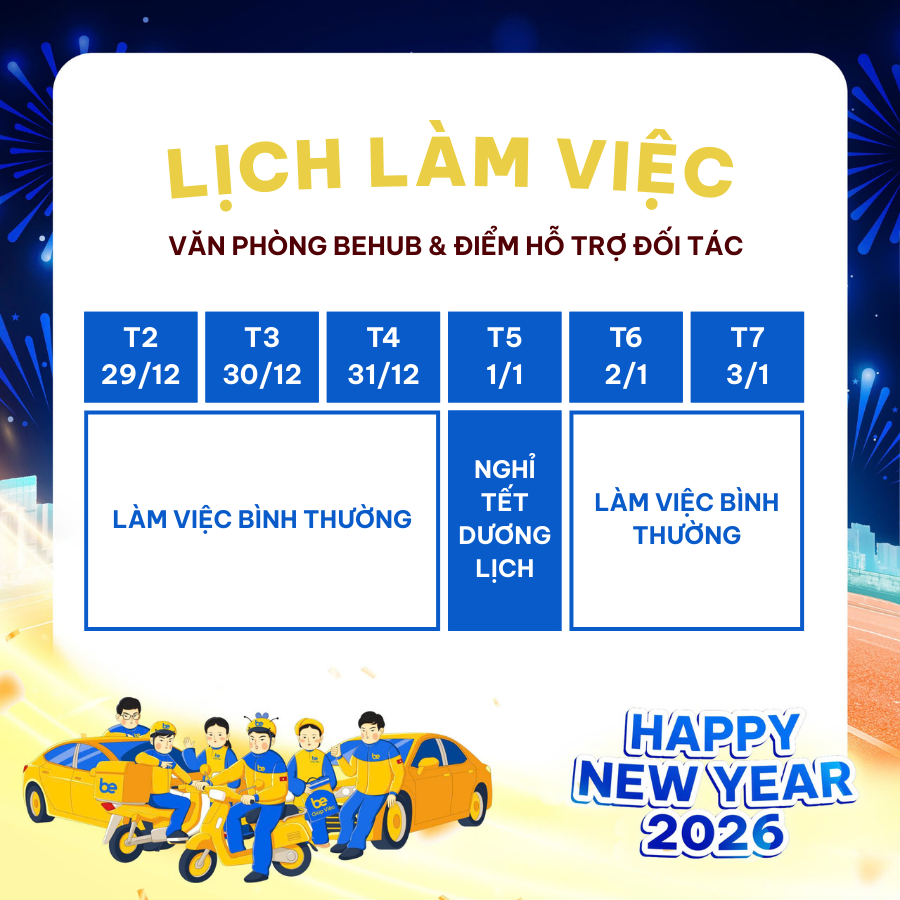 Để thuận tiện cho việc hoạt động trong dịp Tết Dương lịch 2026, Be gửi đến Đối tác lịch hoạt động như sau: