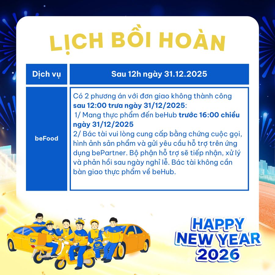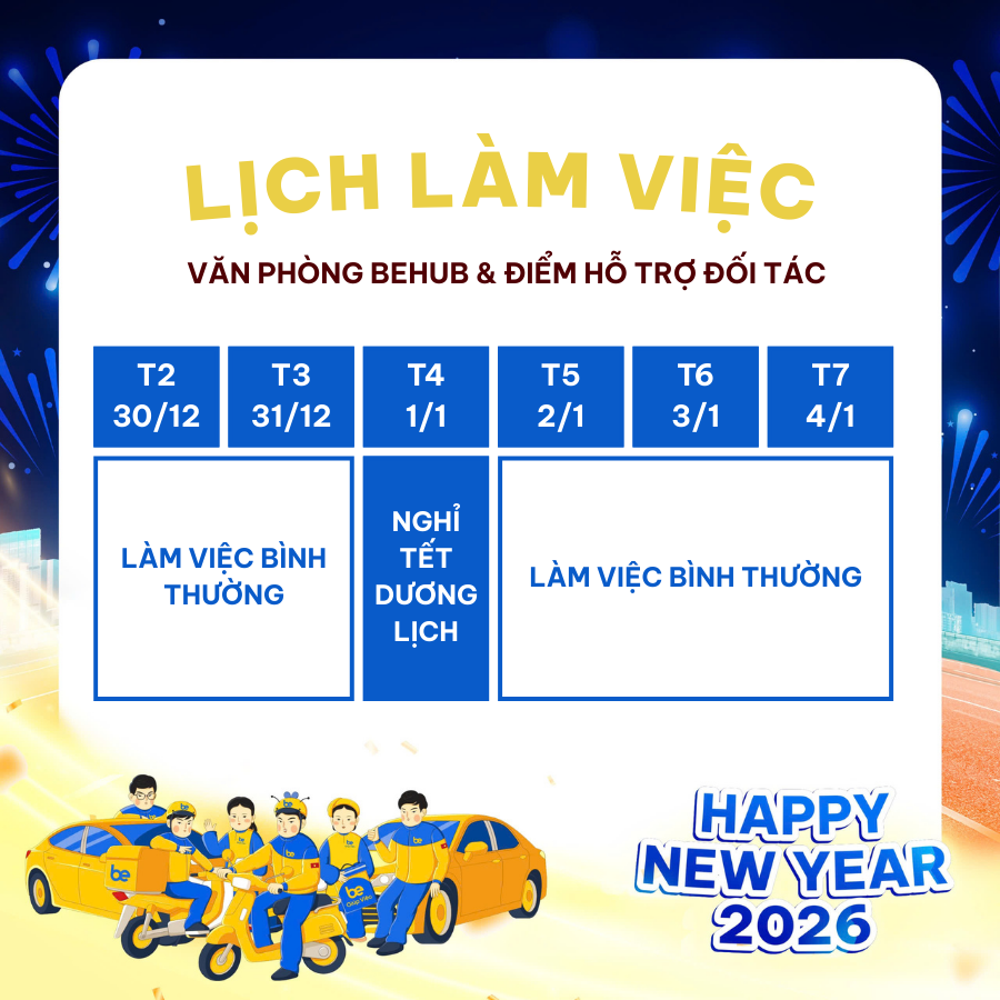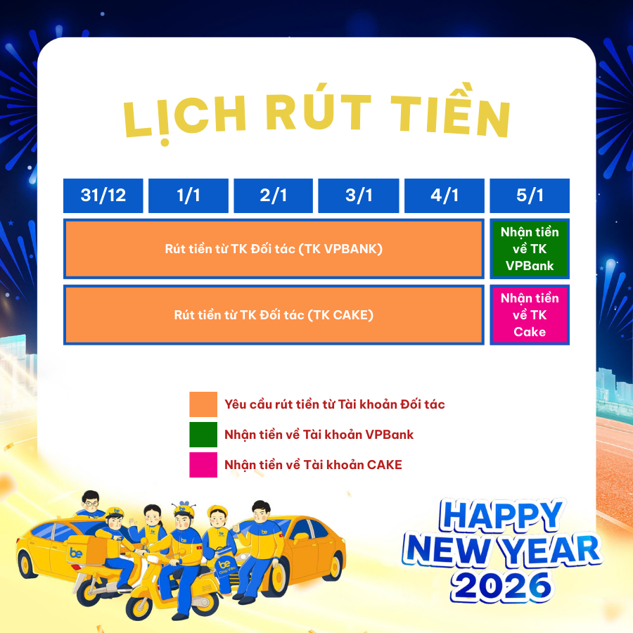 Để thuận tiện cho việc hoạt động trong dịp Tết Dương lịch 2026, Be gửi đến Đối tác lịch hoạt động như sau: