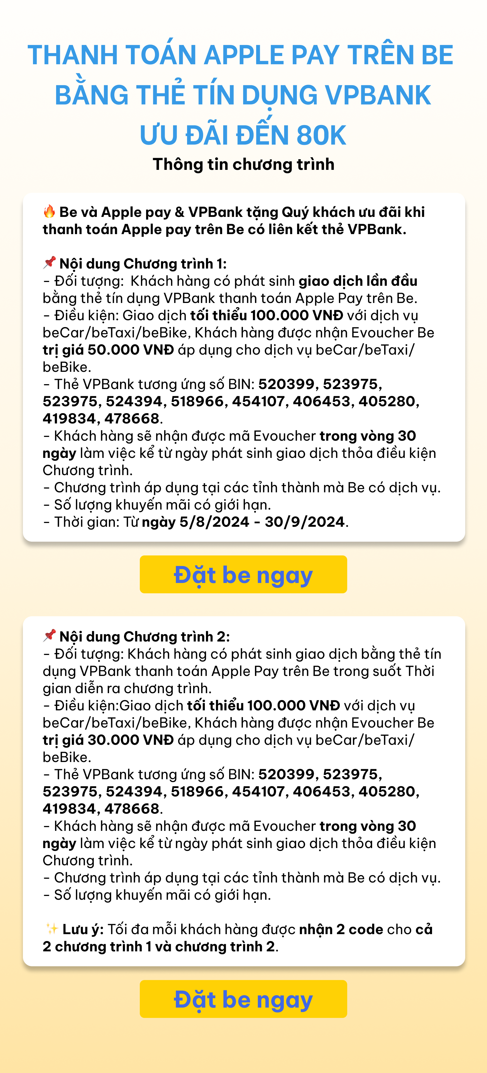 Be x Apple pay & VPBank ưu đãi hấp dẫn