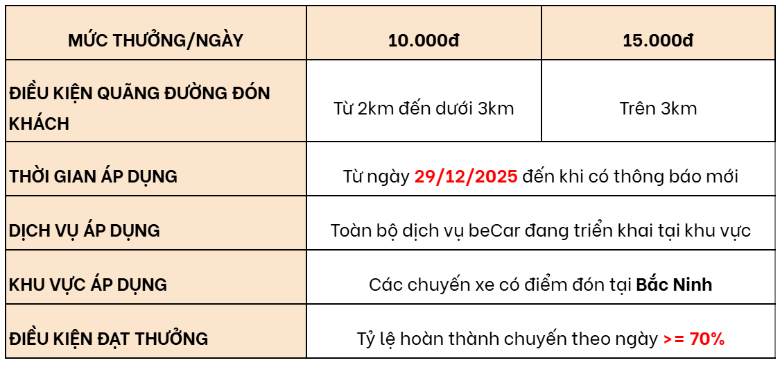 - Từ ngày 29/12/2025: áp dụng điều kiện thưởng tỷ lệ hoàn thành chuyến theo ngày >= 70%