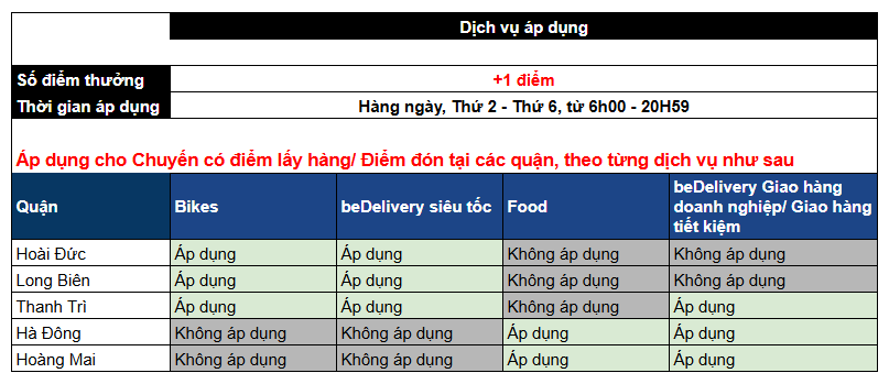 - Chỉ các chuyến Bike hoàn thành & Delivery, Delivery 2H, beFood giao hàng thành công được tính vào chương trình thưởng theo ngày (bao gồm những chuyến đi tỉnh)