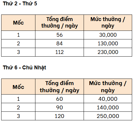 Mốc thưởng và cách tính điểm từ Thứ 2 đến Thứ 5: