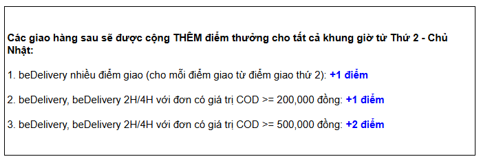 Cộng thêm điểm cho dịch vụ be Giao hàng đơn COD/ đơn nhiều điểm giao