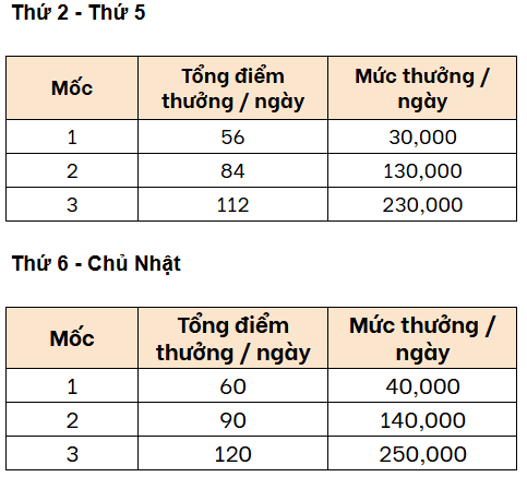 Mốc thưởng và cách tính điểm từ Thứ 2 đến Thứ 5:
