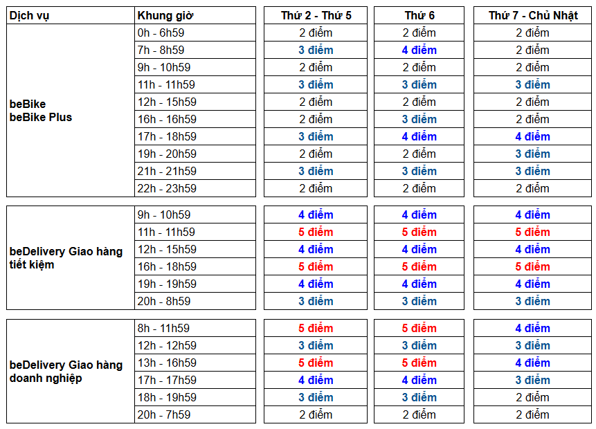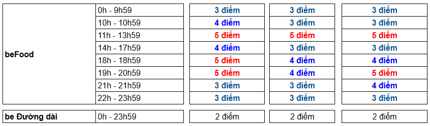 Các giao hàng sau sẽ được cộng THÊM điểm thưởng cho tất cả khung giờ từ Thứ 2 – Chủ Nhật: 1. beDelivery nhiều điểm giao (cho mỗi điểm giao từ điểm giao thứ 2): +1 điểm 2. beDelivery, beDelivery 2H/4H với đơn có giá trị COD >= 200,000 đồng: +1 điểm 3. beDelivery, beDelivery 2H/4H với đơn có giá trị COD >= 500,000 đồng: +2 điểm |