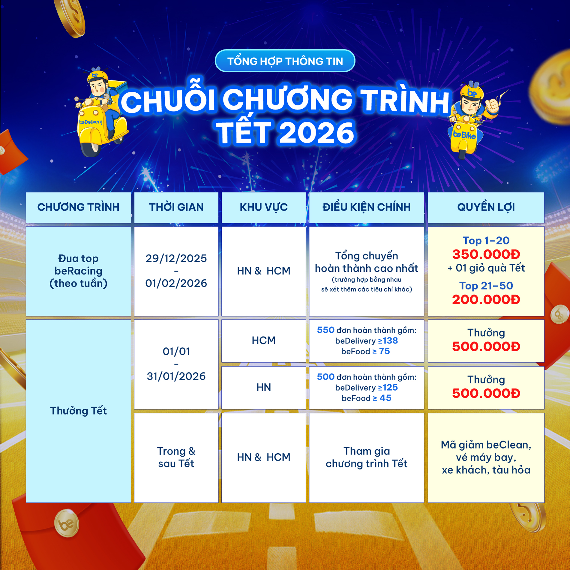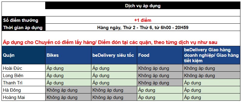 - Chỉ các chuyến Bike hoàn thành & Delivery, Delivery 2H, beFood giao hàng thành công được tính vào chương trình thưởng theo ngày (bao gồm những chuyến đi tỉnh)
