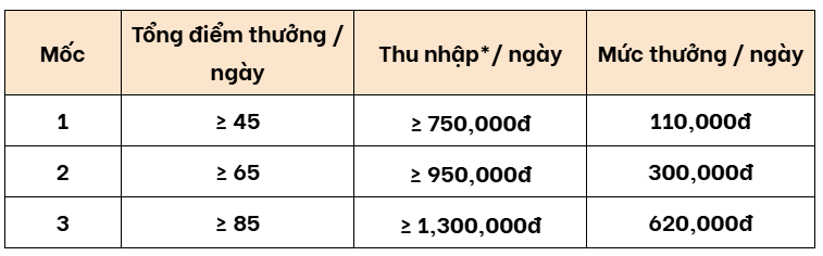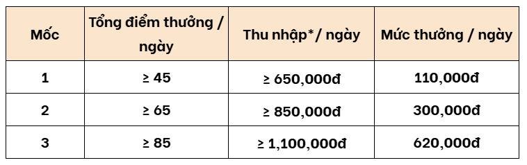 - Nếu tài xế đạt mốc điểm thưởng nhưng không đạt mốc thu nhập thì điểm thưởng và thu nhập sẽ được xét ở mốc thấp hơn.