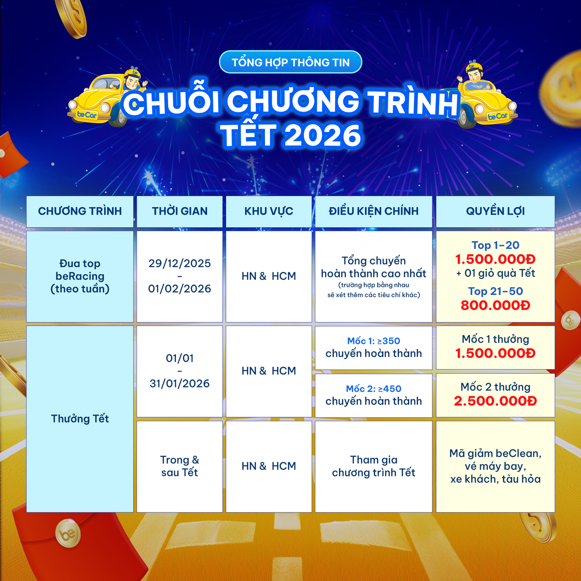 | Đối tượng áp dụng | Tất cả tài xế beCar tại Hà Nội |