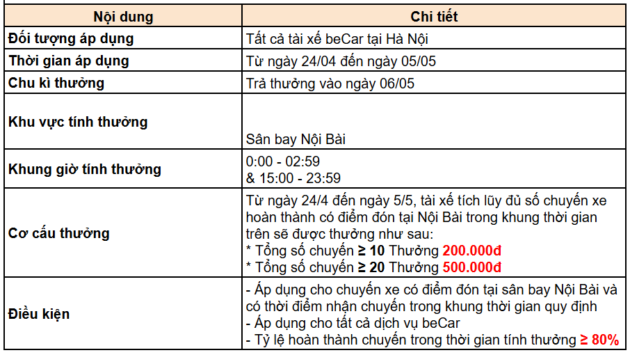 – Chương trình chỉ áp dụng cho Quý Tài xế đạt được các chỉ số sau cho beCar 4 chỗ hoặc beCar 7 chỗ: