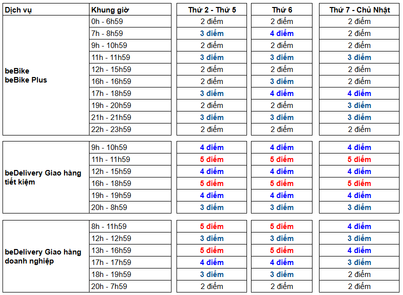 - beCar có quãng đường trên 8km trong khung giờ cao điểm 6:00–8:59 & 16:00–18:59 (Thứ 2 – Thứ 6) và 16:00–18:59 (Thứ 7 – Chủ nhật): +2 điểm