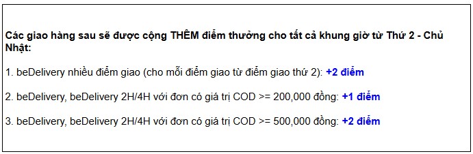 Cộng thêm điểm cho dịch vụ be Giao hàng đơn COD/ đơn nhiều điểm giao