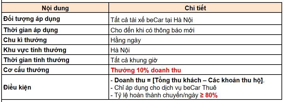 Từ ngày 09/02/2025, Be Group áp dụng chương trình thưởng “Lái nhiều thưởng cao ” dành cho Quý Tài xế beCar tại khu vực Hà Nội như sau: