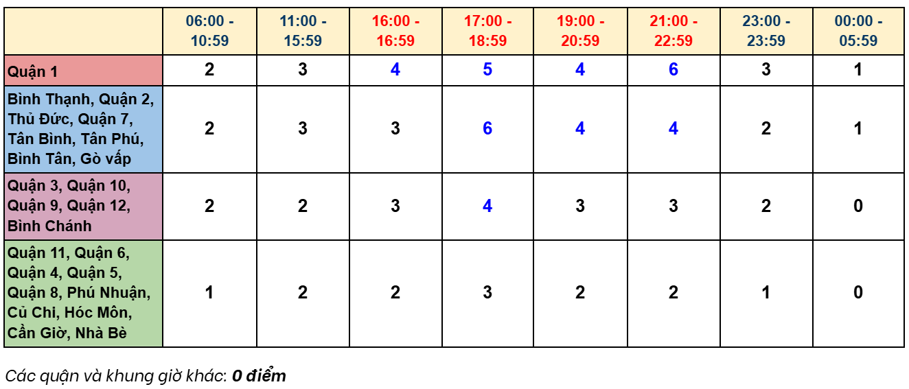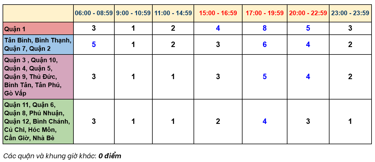 +1 điểm cho tất cả đơn hàng phát sinh thuộc các Quận khung giờ & dịch vụ sau: Quận 2 & Quận 7 & Thủ Đức, từ 6H – 7H59, thứ 2 – thứ 6