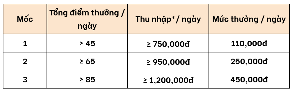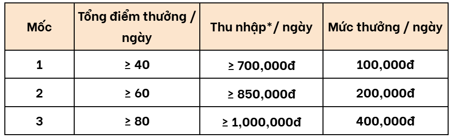 - Nếu tài xế đạt mốc điểm thưởng nhưng không đạt mốc thu nhập thì điểm thưởng và thu nhập sẽ được xét ở mốc thấp hơn.