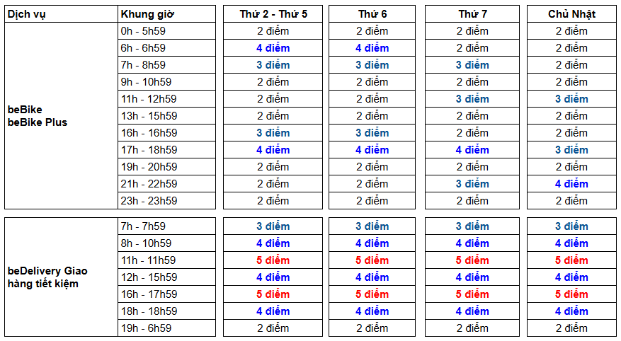+1 điểm cho tất cả đơn hàng phát sinh thuộc các Quận khung giờ & dịch vụ sau: – beBikes: Quận 2 & Quận 7 & Thủ Đức, từ 6H – 7H59, thứ 2 – thứ 6 |