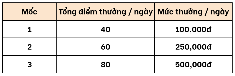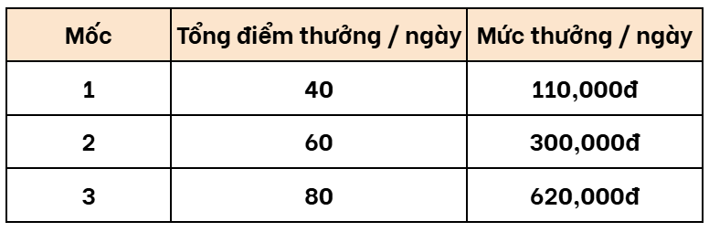 | Mốc | Tổng số điểm/ngày | Mức thưởng/ngày |