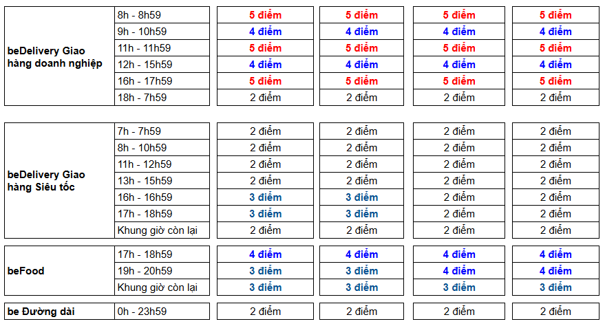 Các giao hàng sau sẽ được cộng THÊM điểm thưởng cho tất cả khung giờ từ Thứ 2 – Chủ Nhật: 1. beDelivery nhiều điểm giao (cho mỗi điểm giao từ điểm giao thứ 2): +1 điểm 2. beDelivery, beDelivery 2H/4H với đơn có giá trị COD >= 200,000 đồng: +1 điểm 3. beDelivery, beDelivery 2H/4H với đơn có giá trị COD >= 500,000 đồng: +2 điểm |