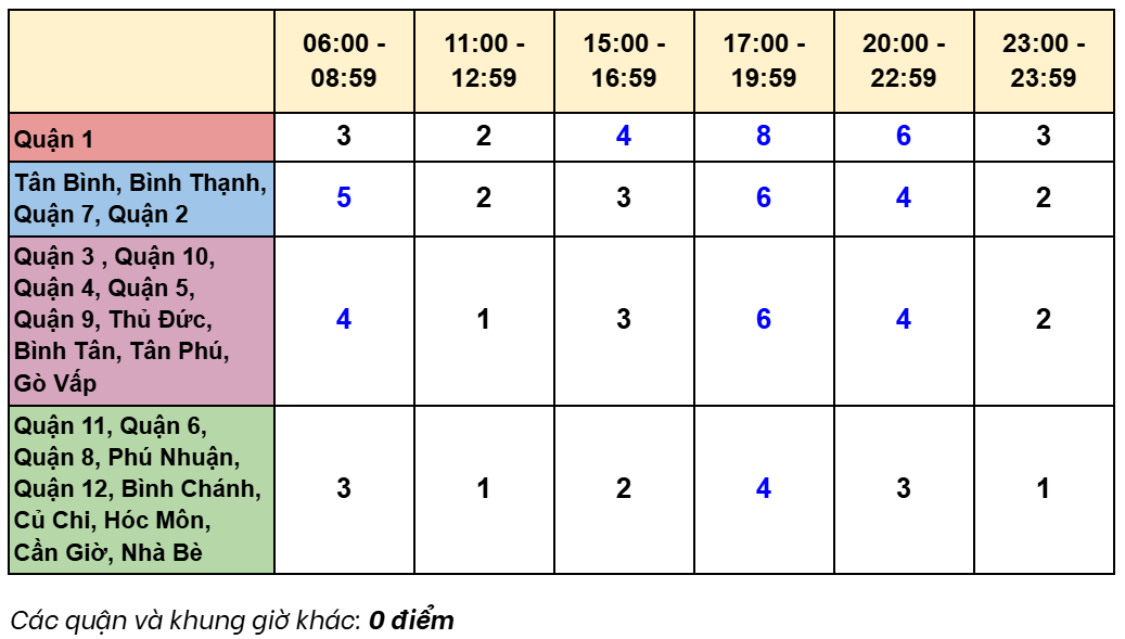 - Bác tài hoàn thành chuyến xe với quãng đường 1km có thời điểm nhận chuyến là 17:10 ở Quận 2, bác tài nhận được 6-1 = 5 điểm.
