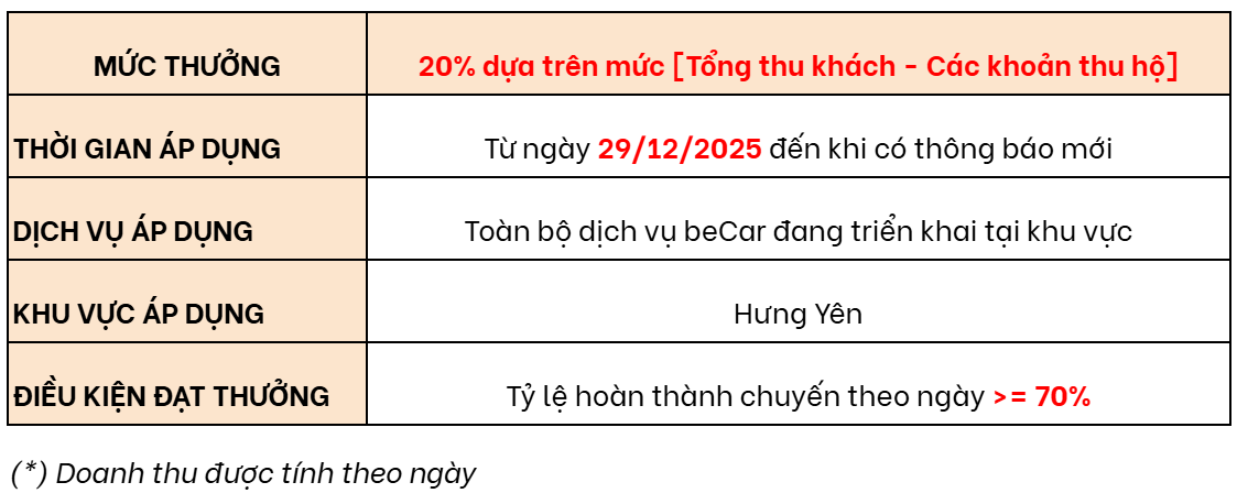 - Từ ngày 29/12/2025: áp dụng điều kiện thưởng tỷ lệ hoàn thành chuyến theo ngày >= 70%