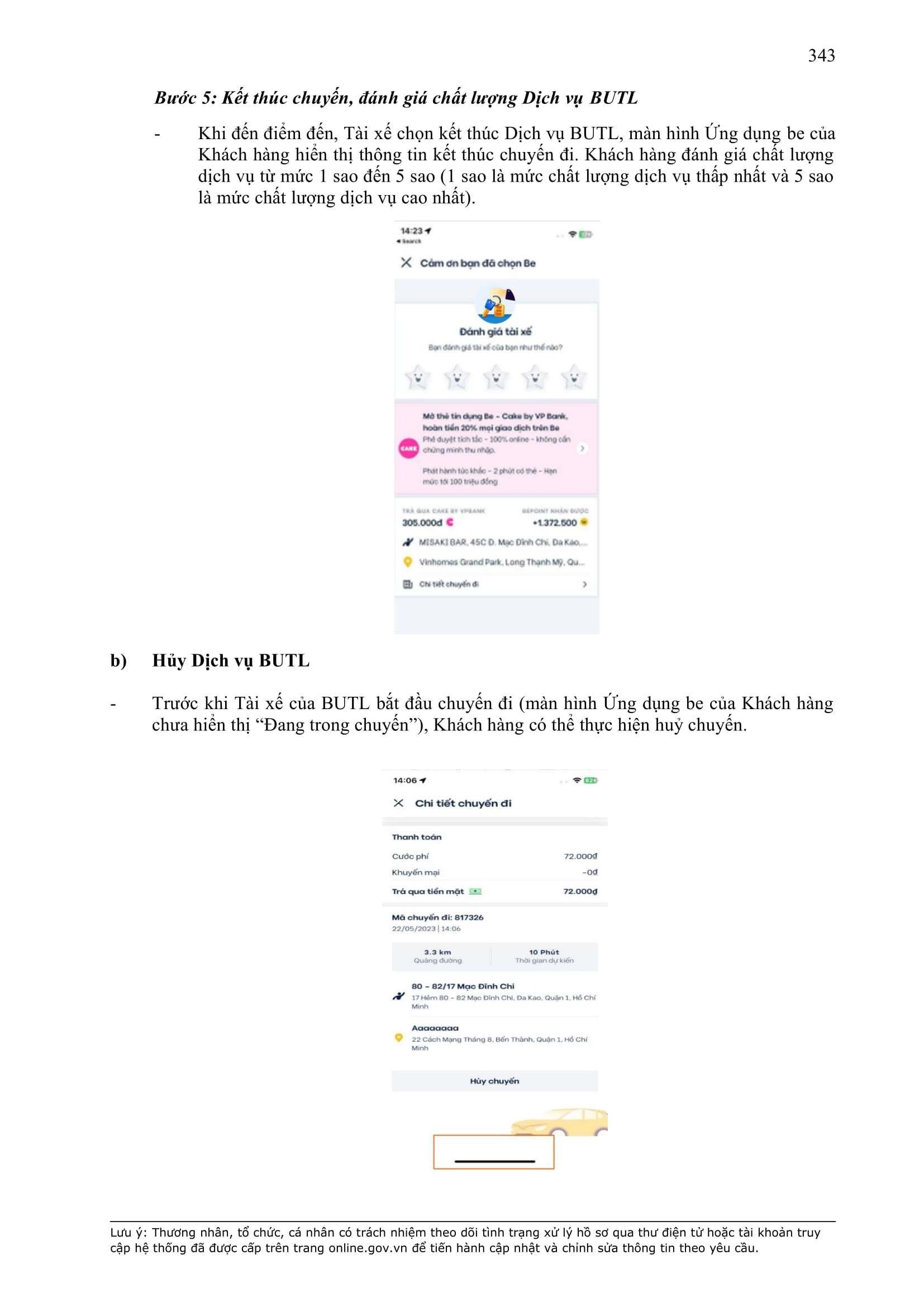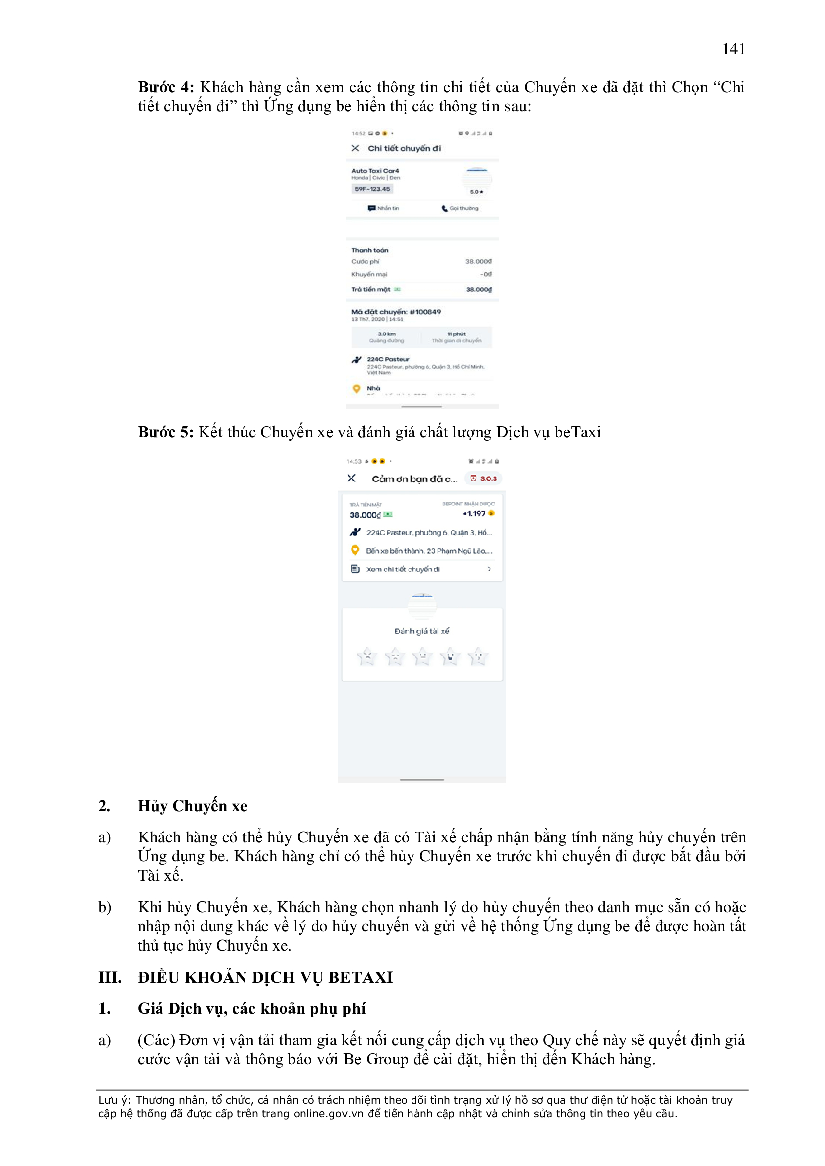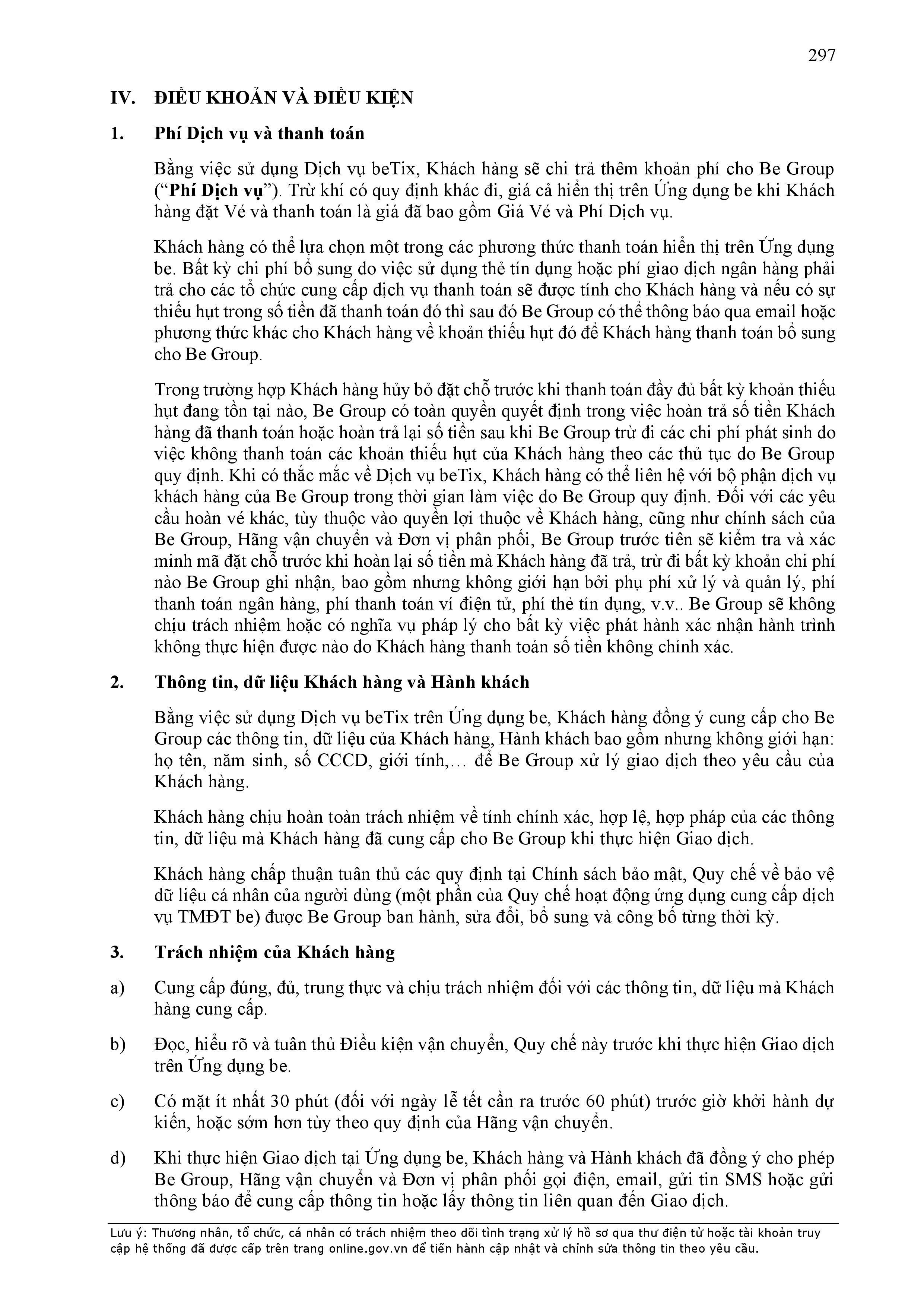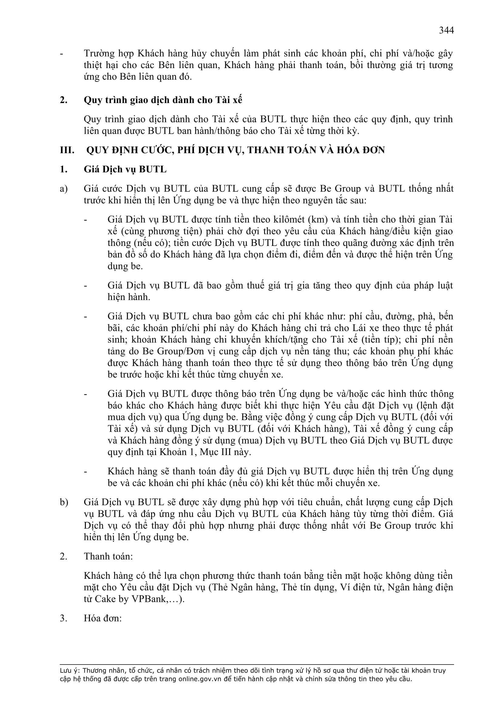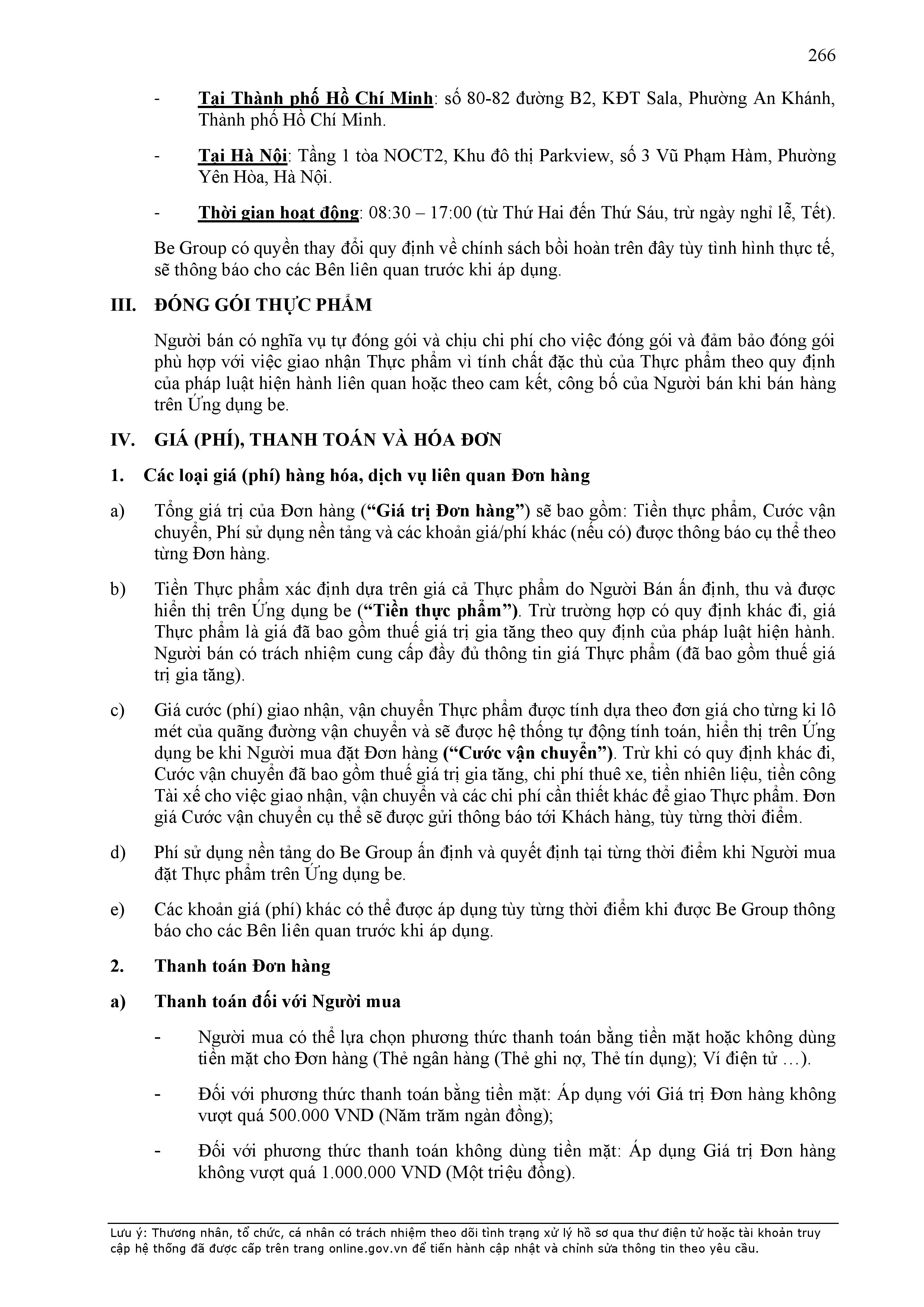 - Thời điểm thanh toán: Thanh toán trước hoặc thanh toán ngay khi kết thúc chuyến xe, tùy thuộc vào phương thức thanh toán đối với từng sản phẩm/dịch vụ được công bố trên Ứng dụng be.