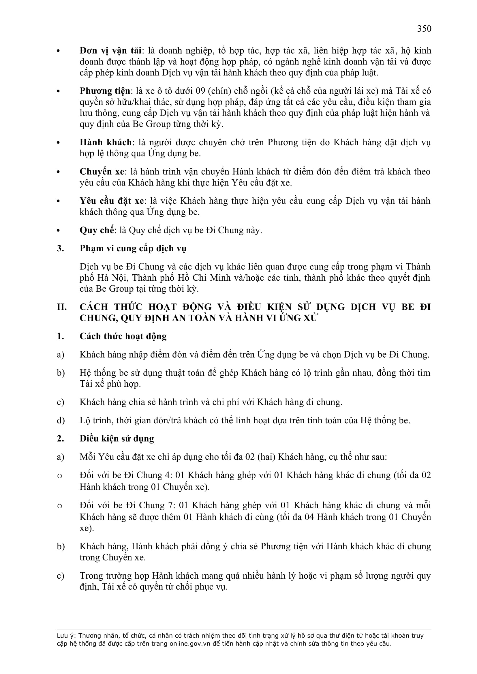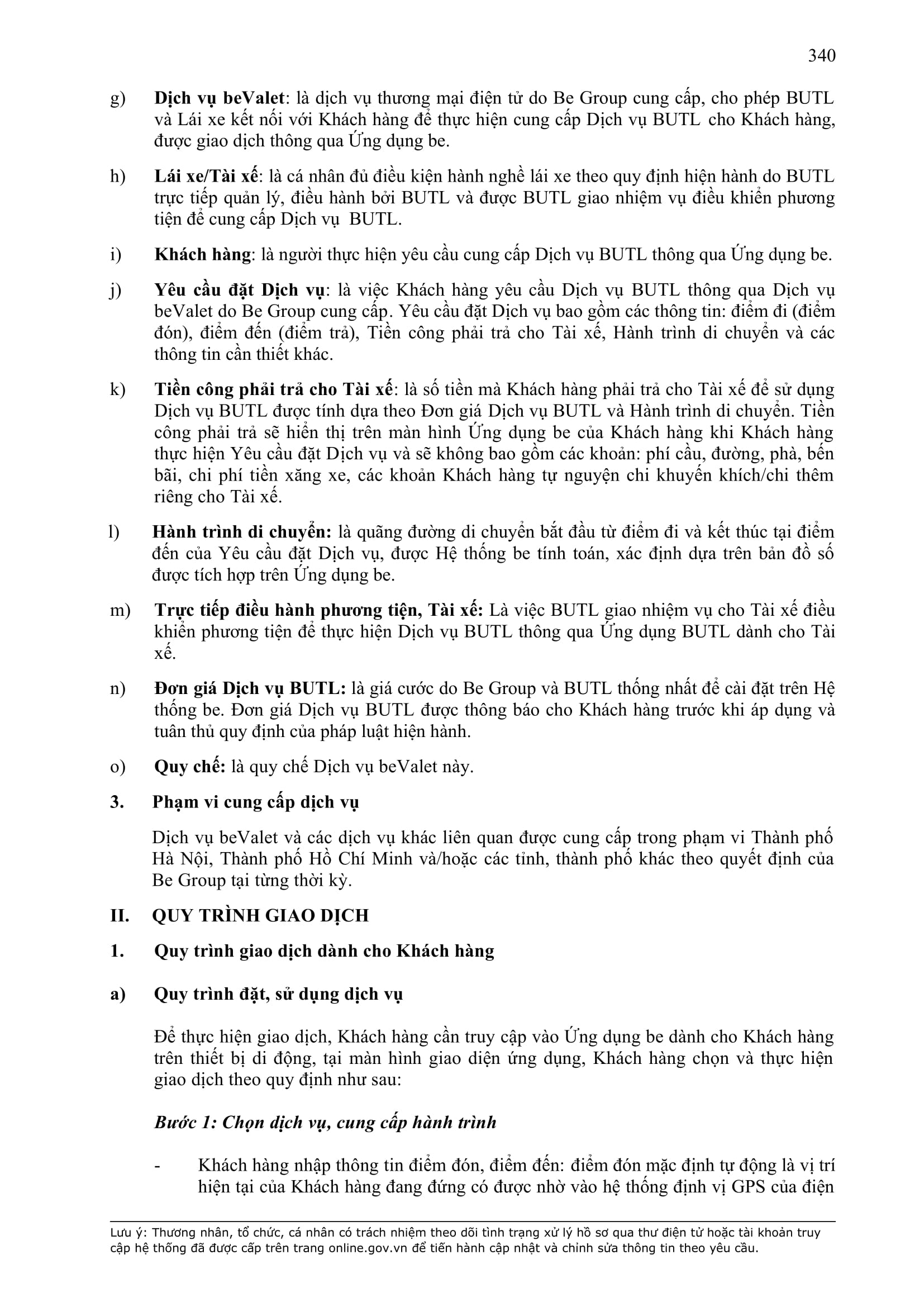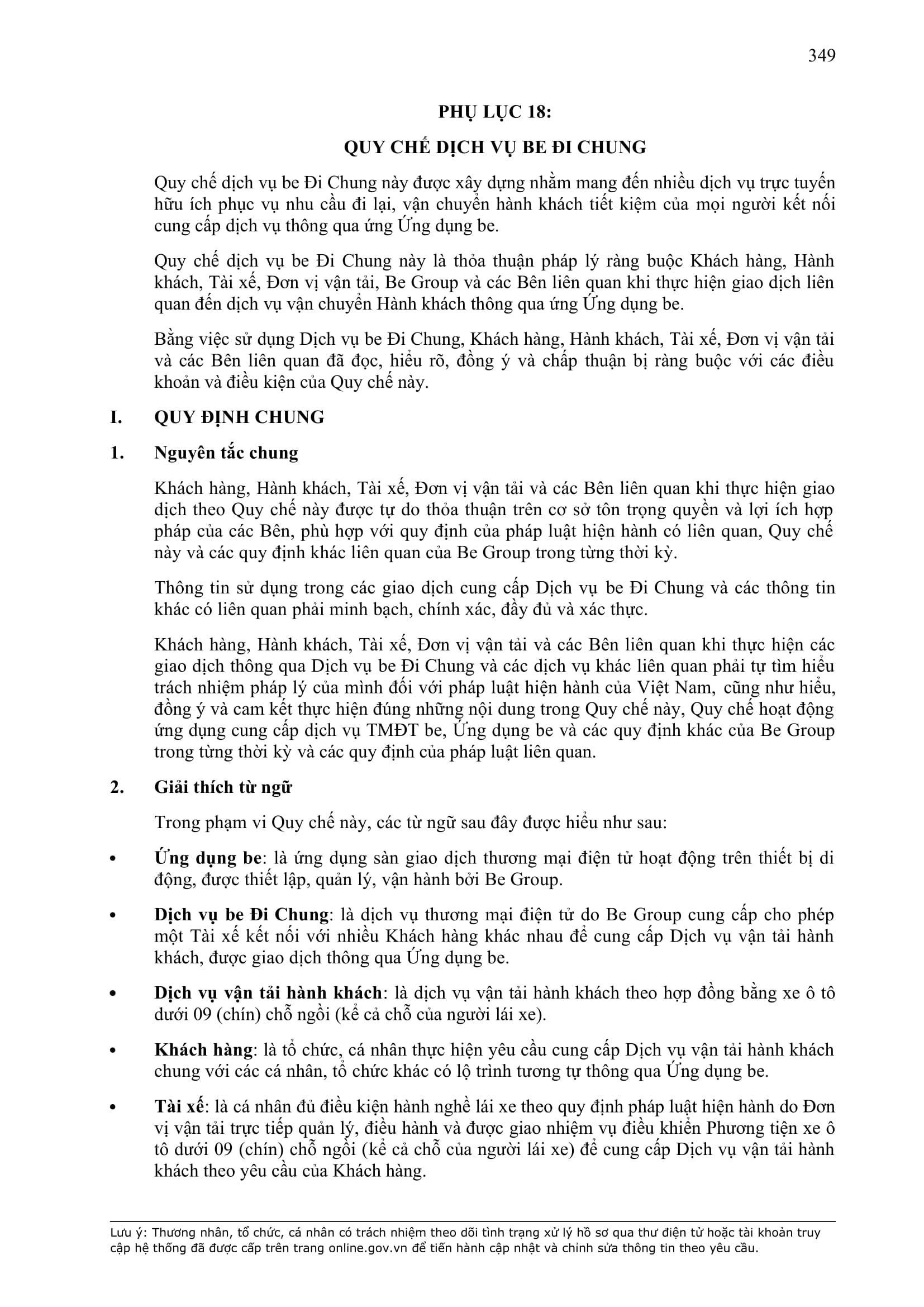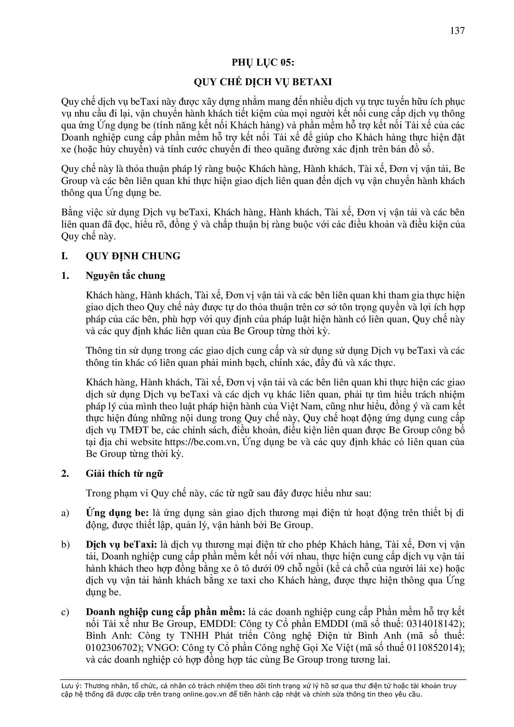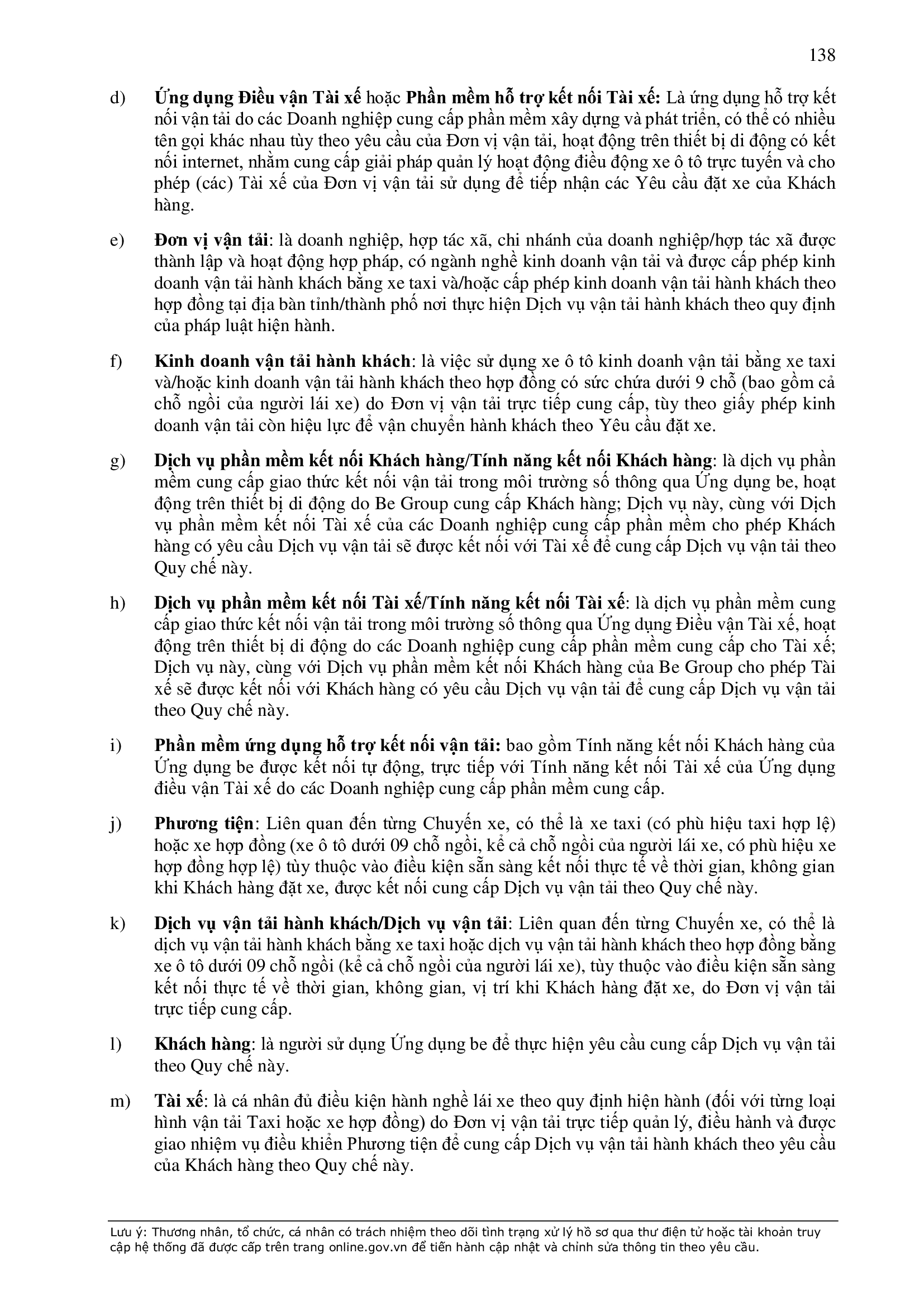 b) “Ứng dụng Be” có nghĩa là ứng dụng trên thiết bị di động cung cấp dịch vụ thương mại điện tử trong lĩnh vực giao thông vận tải được thiết lập, quản lý và vận hành bởi BE GROUP.