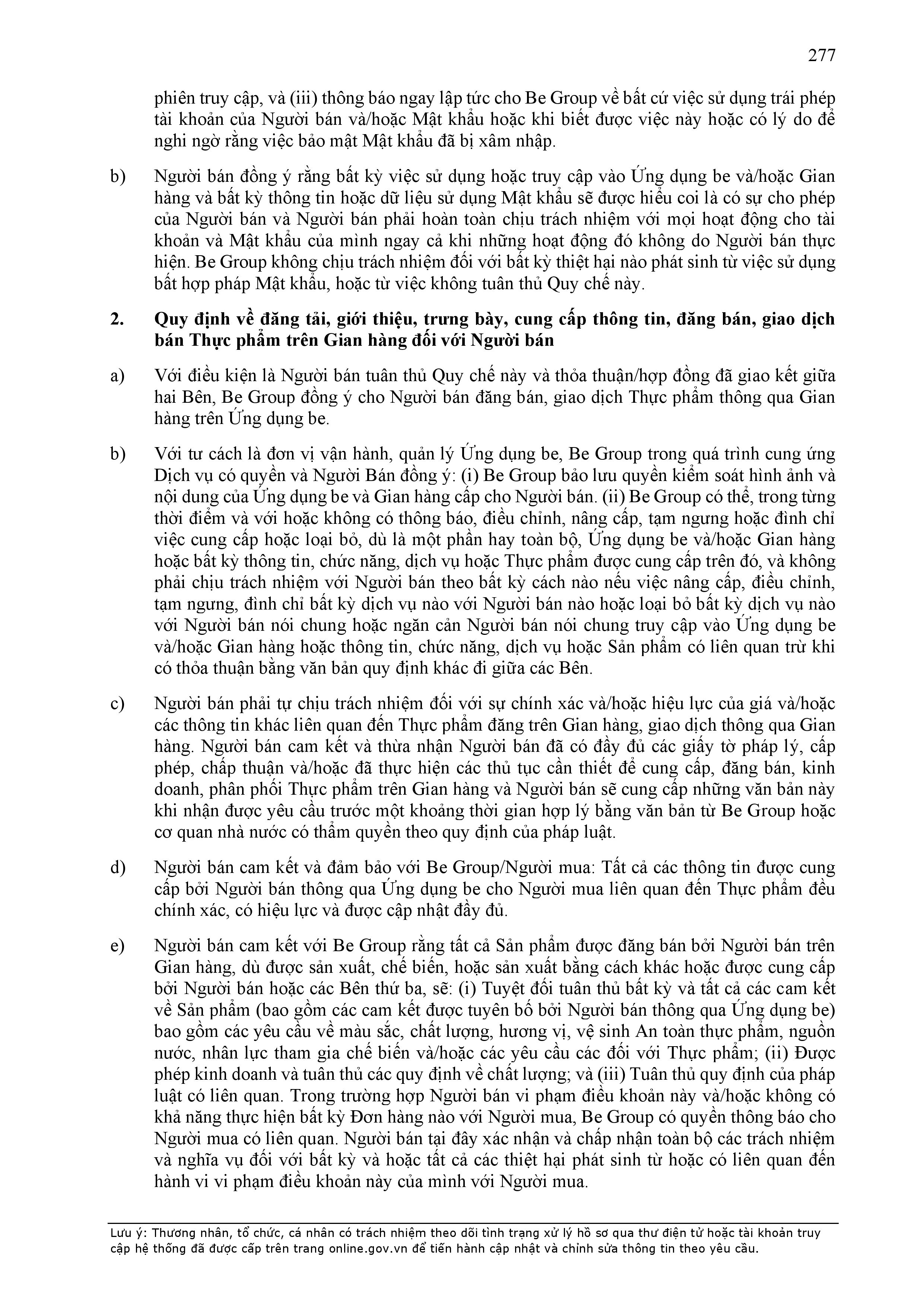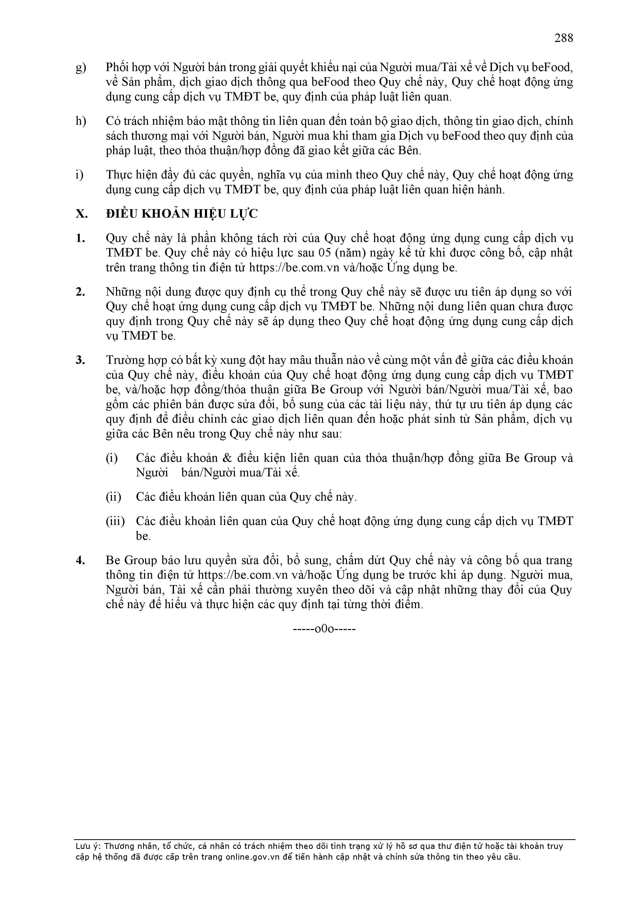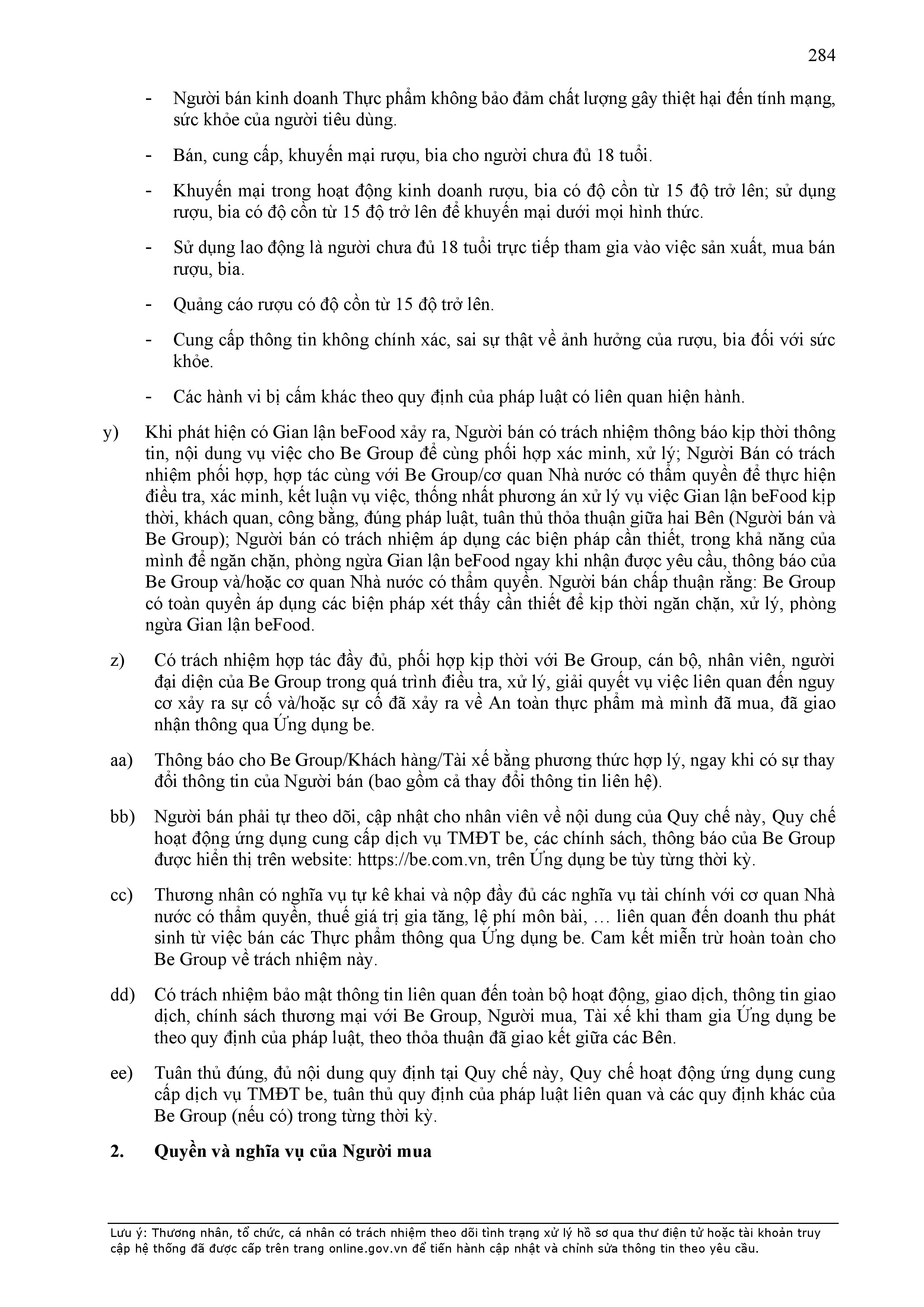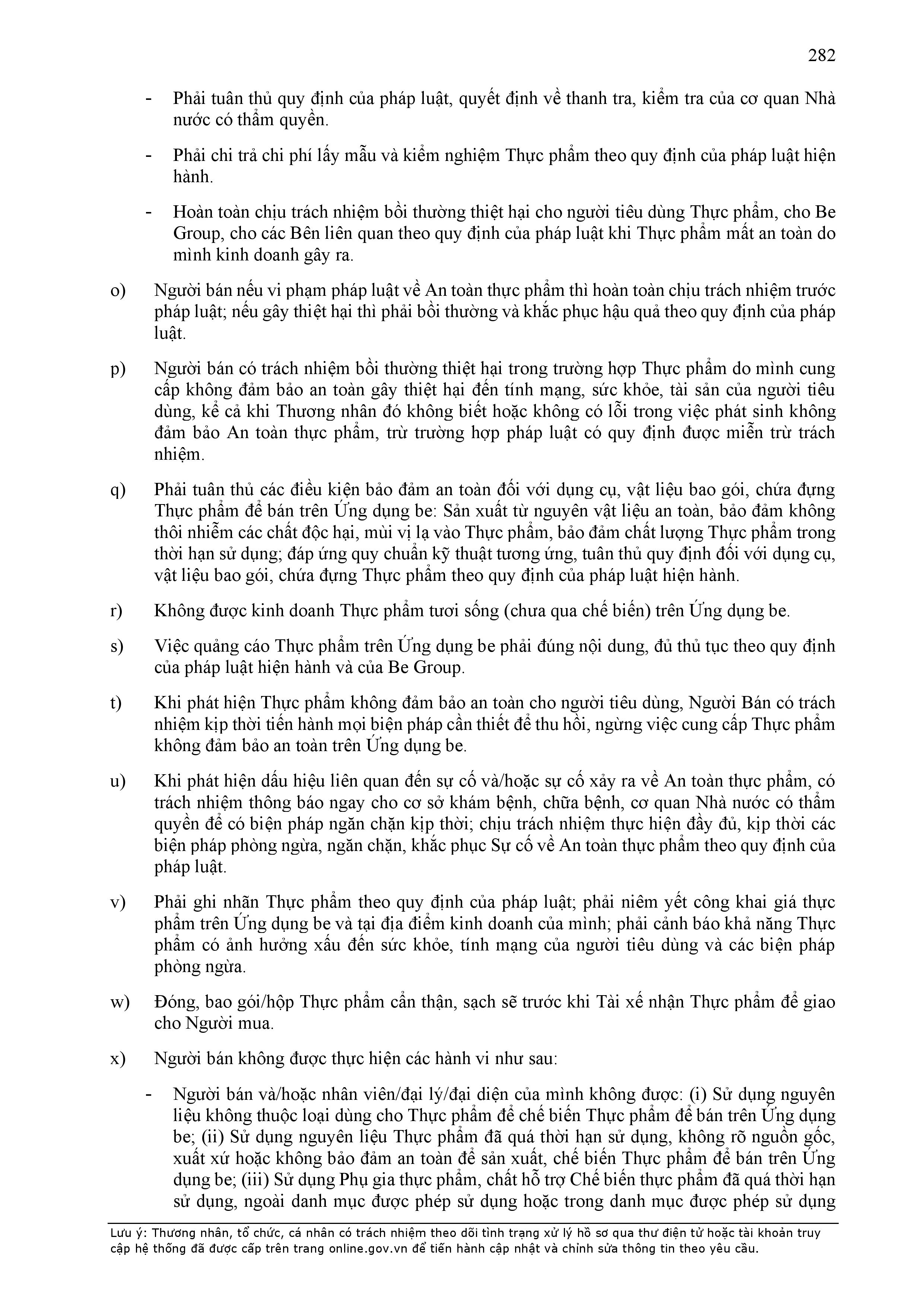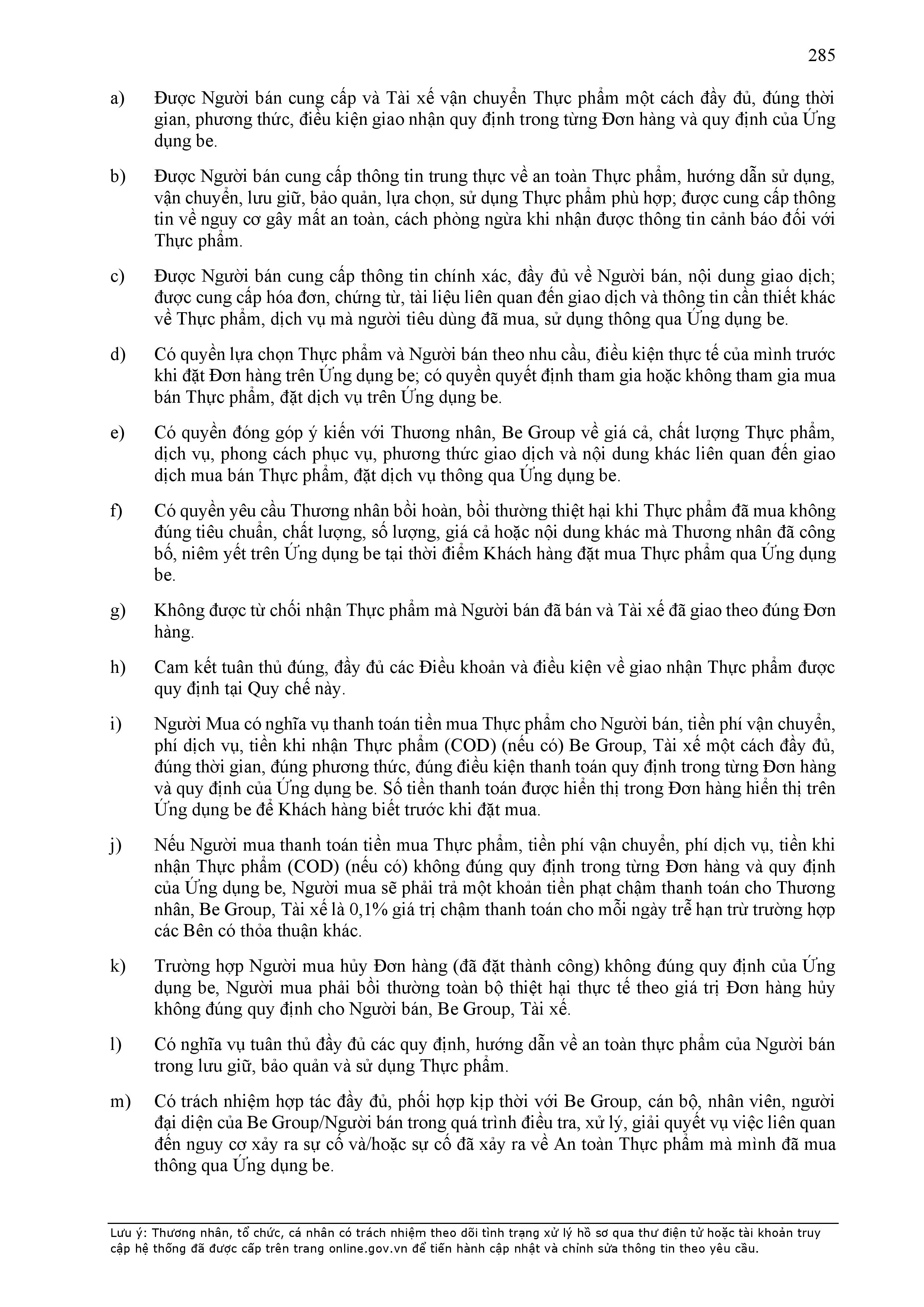 - Tuân thủ đầy đủ, đúng các quy định đã thỏa thuận tại Hợp Đồng này, quy định của pháp luật; chính sách, quy chế, quy định, điều khoản sử dụng, chuẩn mực dịch vụ, Quy chế hoạt động ứng dụng cung cấp dịch vụ TMĐT be (bao gồm cả Quy chế về bảo vệ dữ liệu cá nhân người dùng, Bộ quy tắc ứng xử…) được công bố tại website: https://www.be.com.vn, Ứng dụng be và/hoặc theo thông báo của BE GROUP và/hoặc Đơn Vị Vận Tải tại từng thời điểm.
