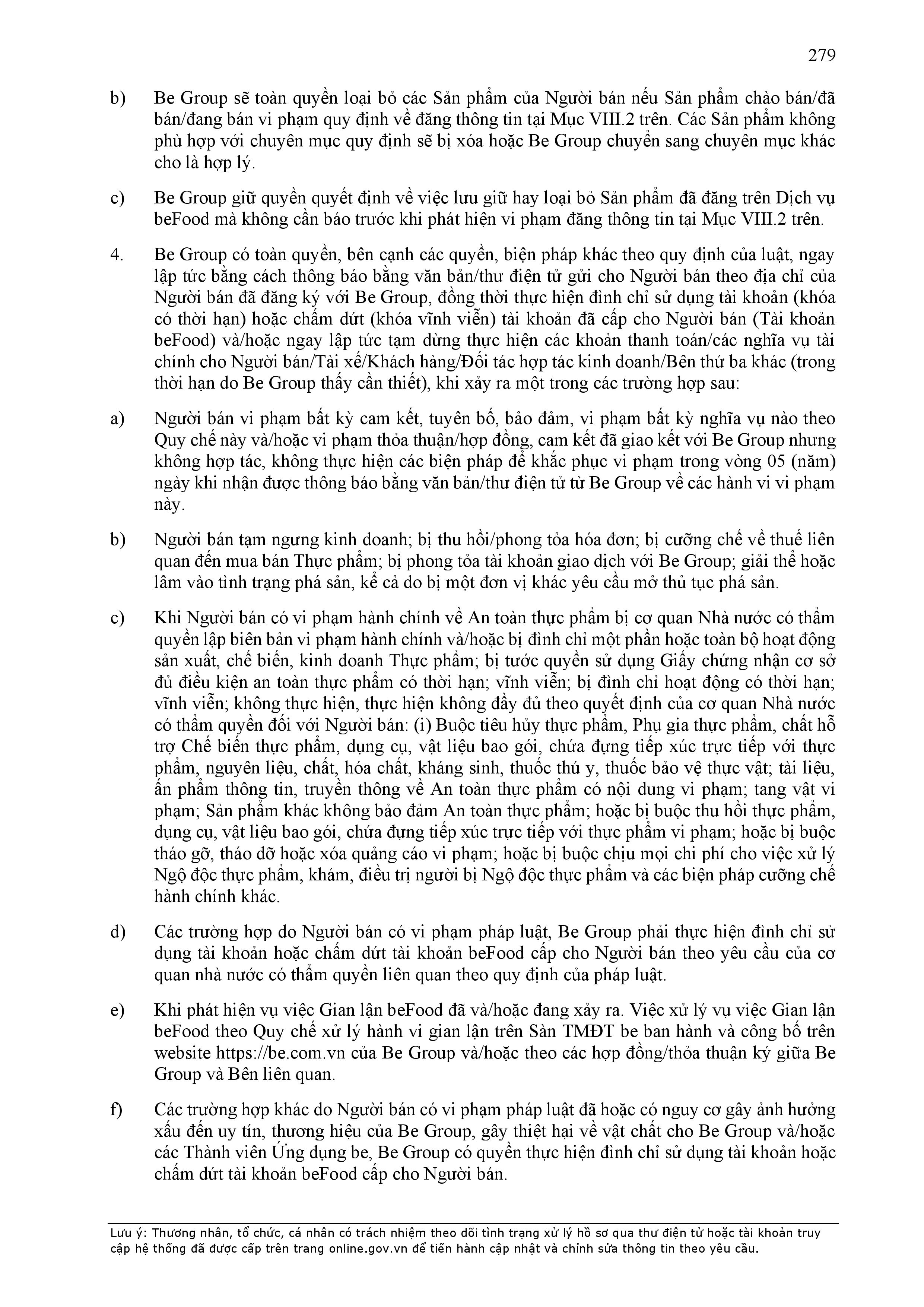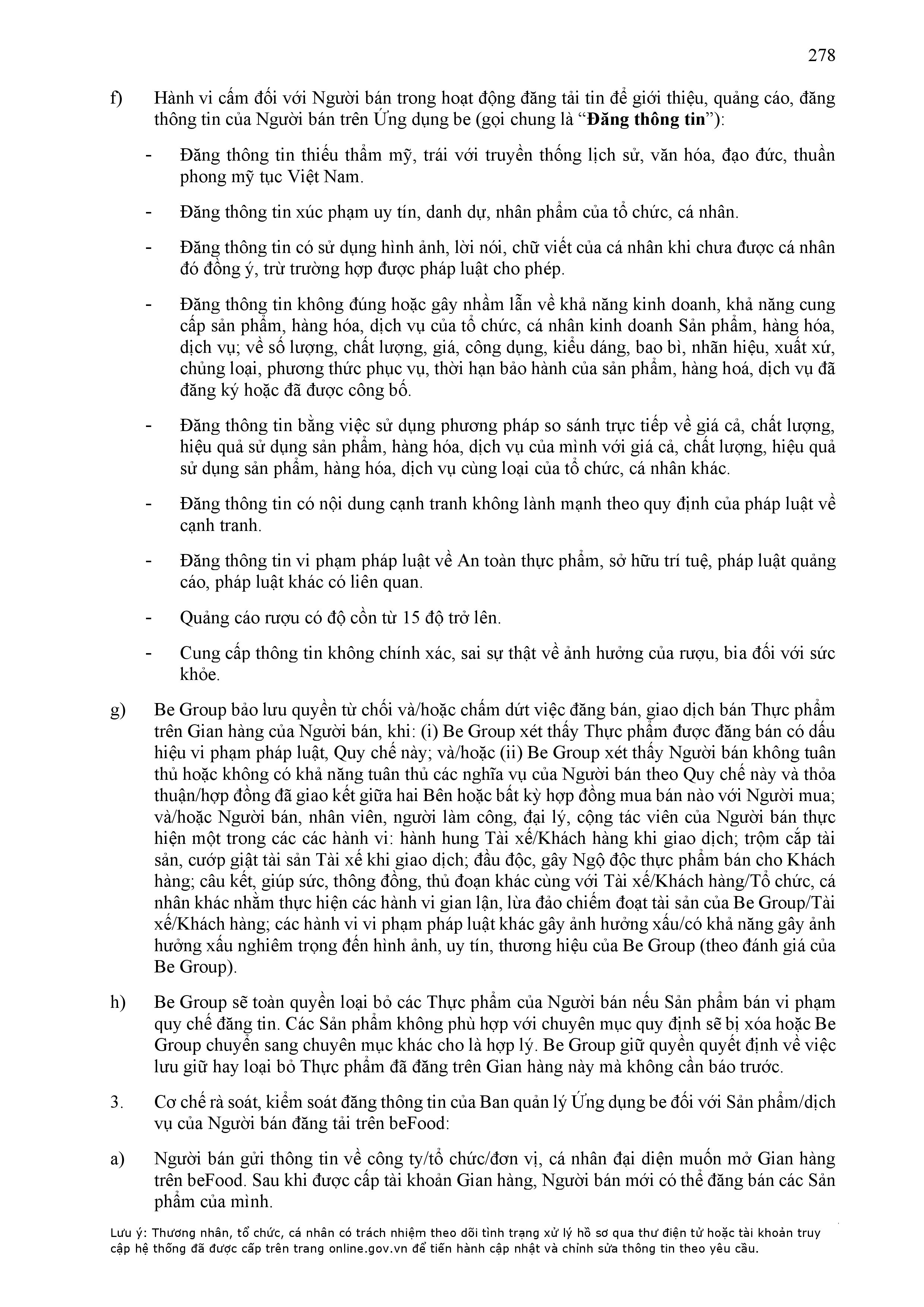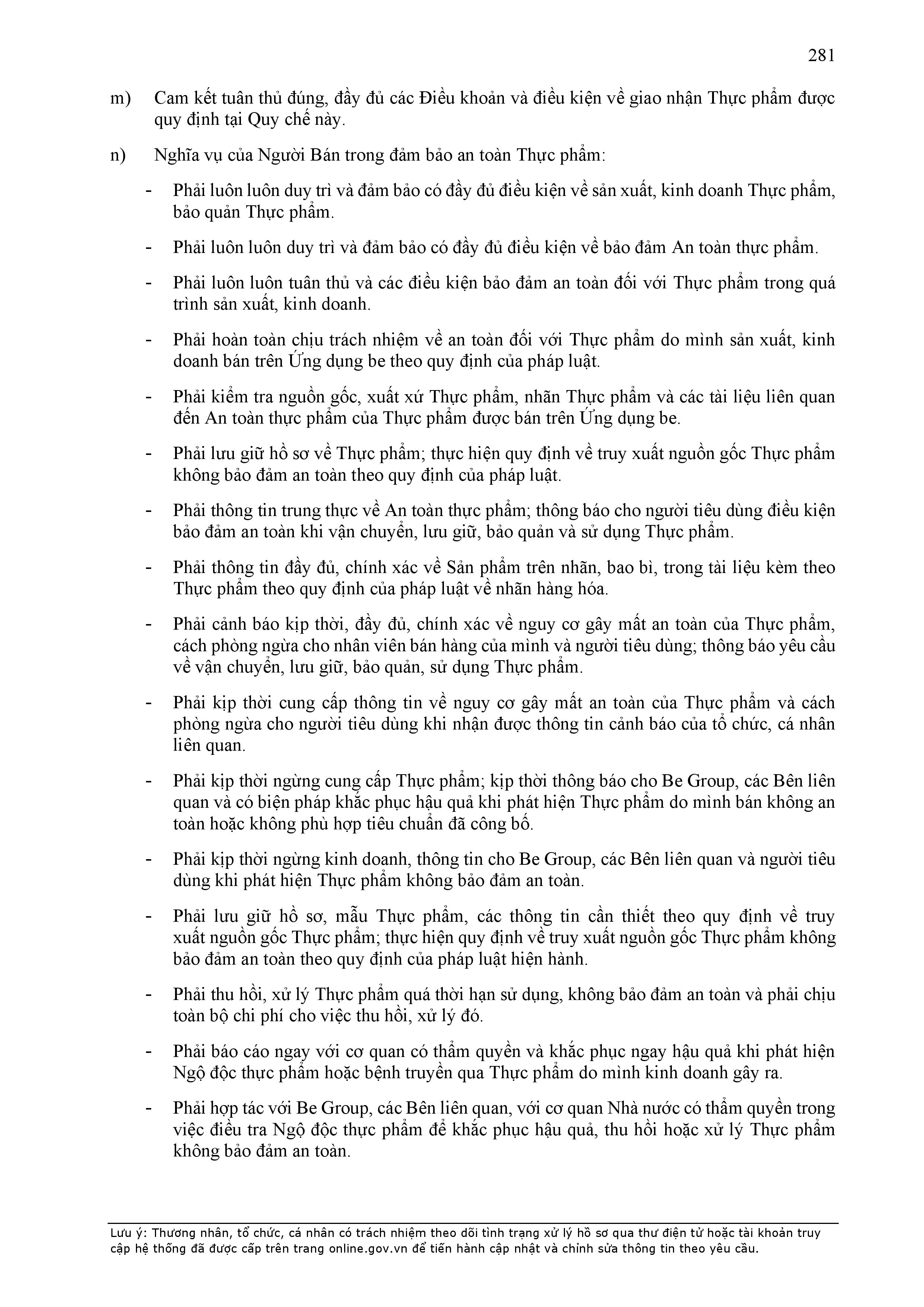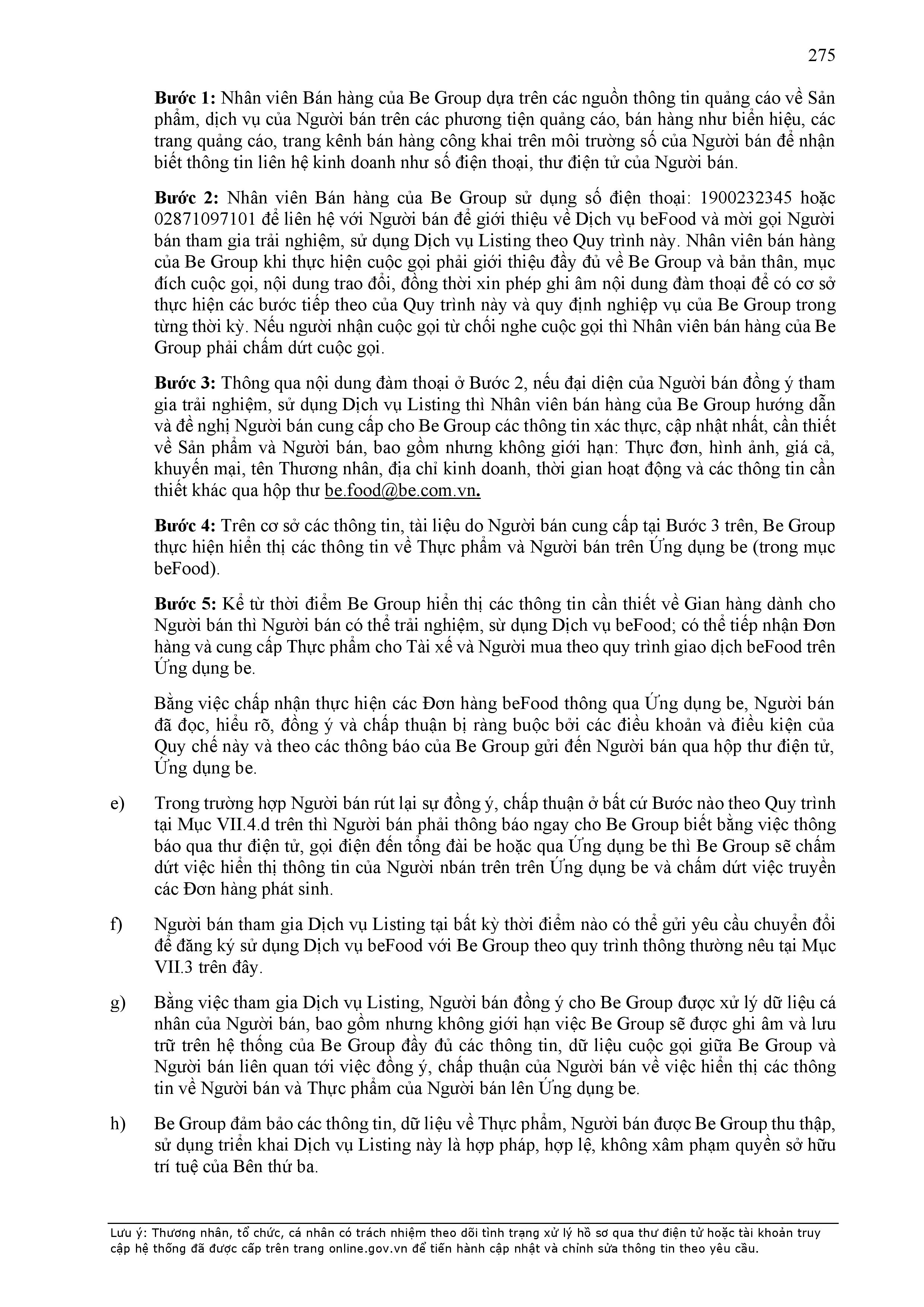 - Tuân thủ đầy đủ, đúng các quy định đã thỏa thuận tại Hợp Đồng này, quy định của pháp luật; chính sách, quy chế, quy định, điều khoản sử dụng, chuẩn mực dịch vụ, Quy chế hoạt động ứng dụng cung cấp dịch vụ TMĐT be (bao gồm cả Quy chế về bảo vệ dữ liệu cá nhân người dùng, Bộ quy tắc ứng xử…) được công bố tại website: https://www.be.com.vn, Ứng dụng be và/hoặc theo thông báo của BE GROUP và/hoặc Đơn Vị Vận Tải tại từng thời điểm.